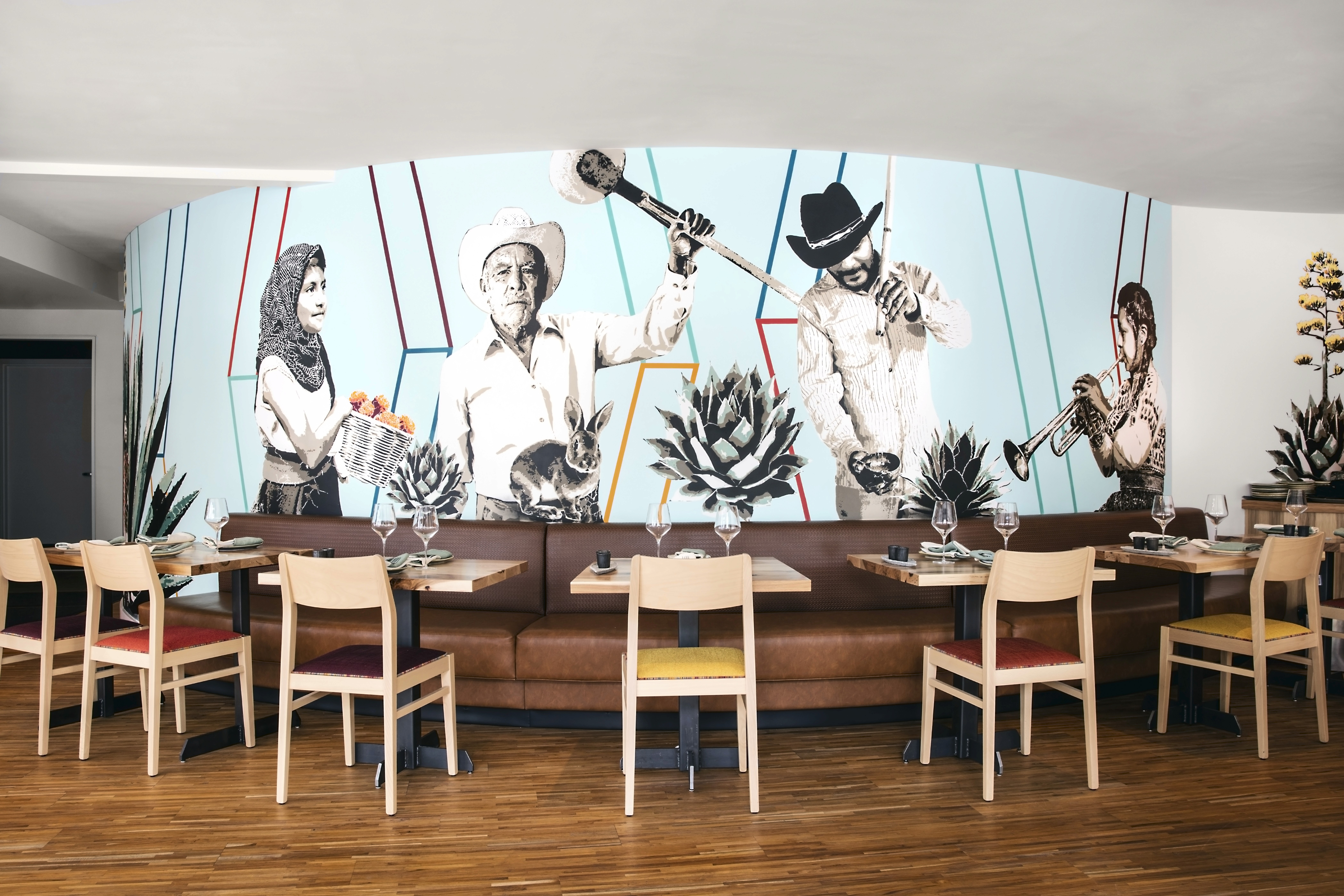 The bar boasts a faceted display of folded steel planes woven and welded into a dazzling centerpiece. The intricate custom metalwork was inspired by the geometric folds of agave leaves and draws visitors to the energetic center of the restaurant. Lapiztola, an Oaxaca-based art collective, worked with the design team to create a compelling mural paying homage to the sharing of wisdom and tradition, the creation of mezcal, social empowerment and community.