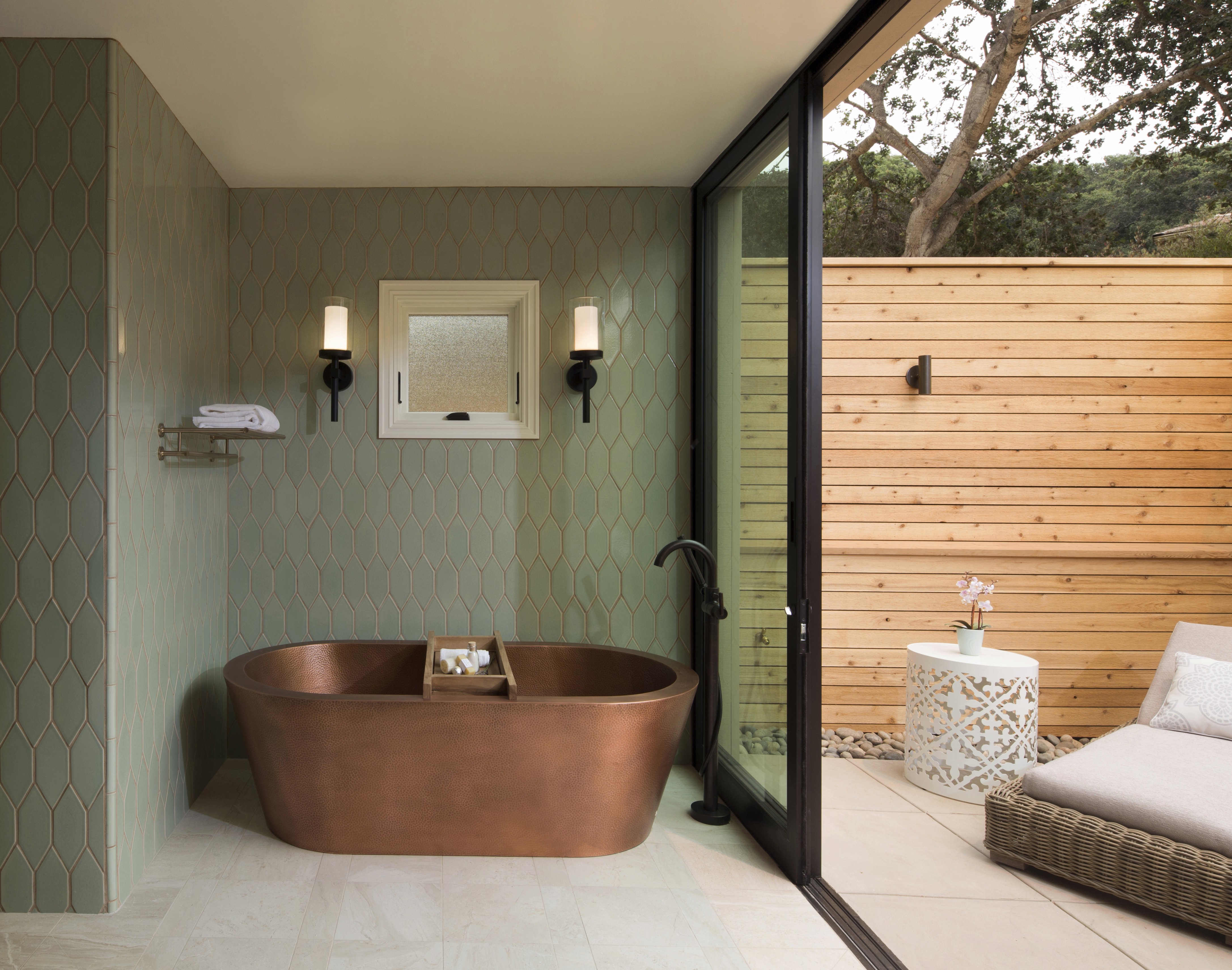 Rich with handcrafted details, soft muted tones and warm mixed metals, the design of the Bernardus Lodge & Spa villas and suites reflects the luxe yet relaxed atmosphere of Carmel Valley, California. Arcsine was selected to design the guestroom baths as well as source additional furnishings for the guestroom suites for a total of eight new buildings consisting of 14 suites and two villas.