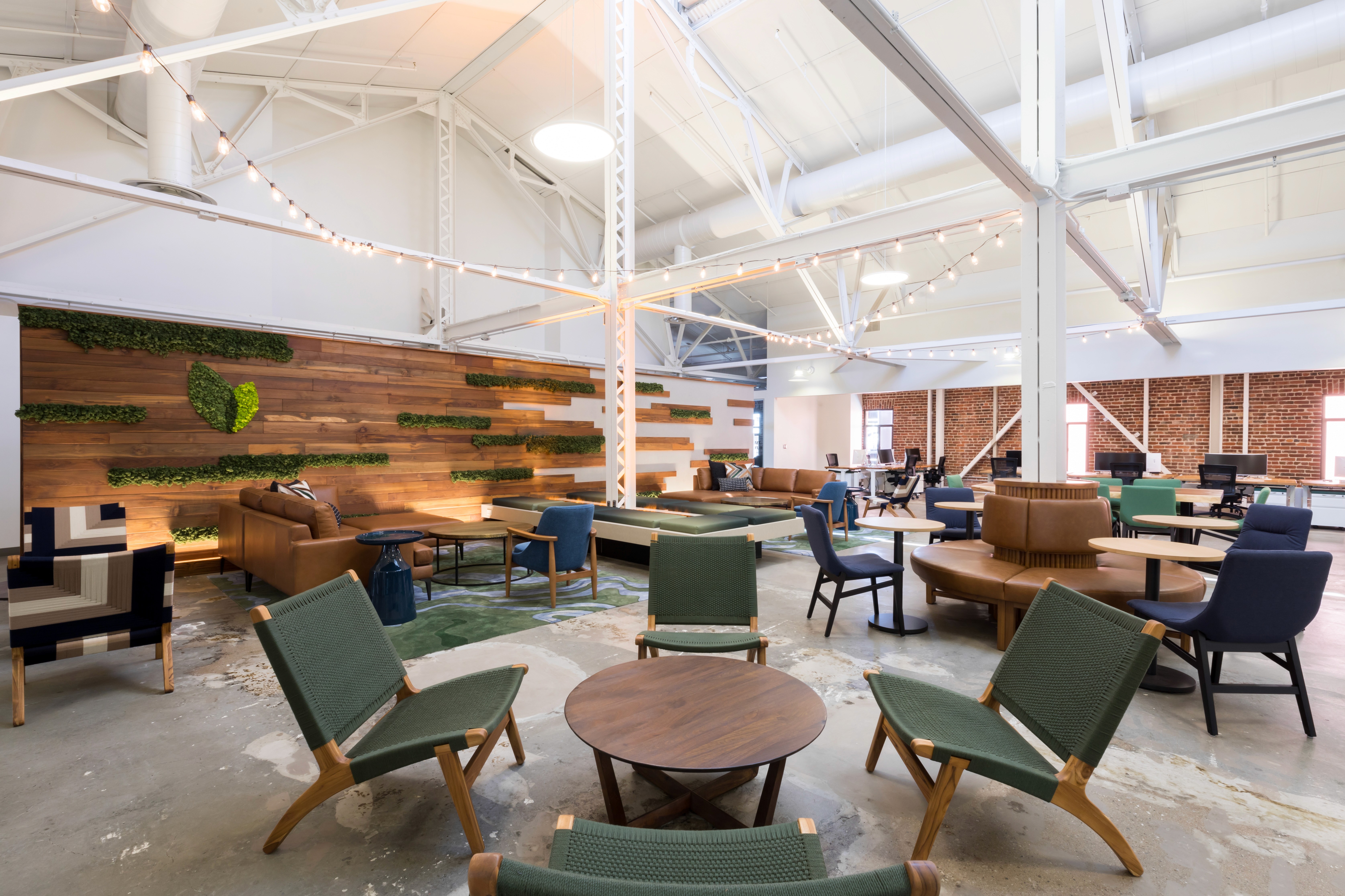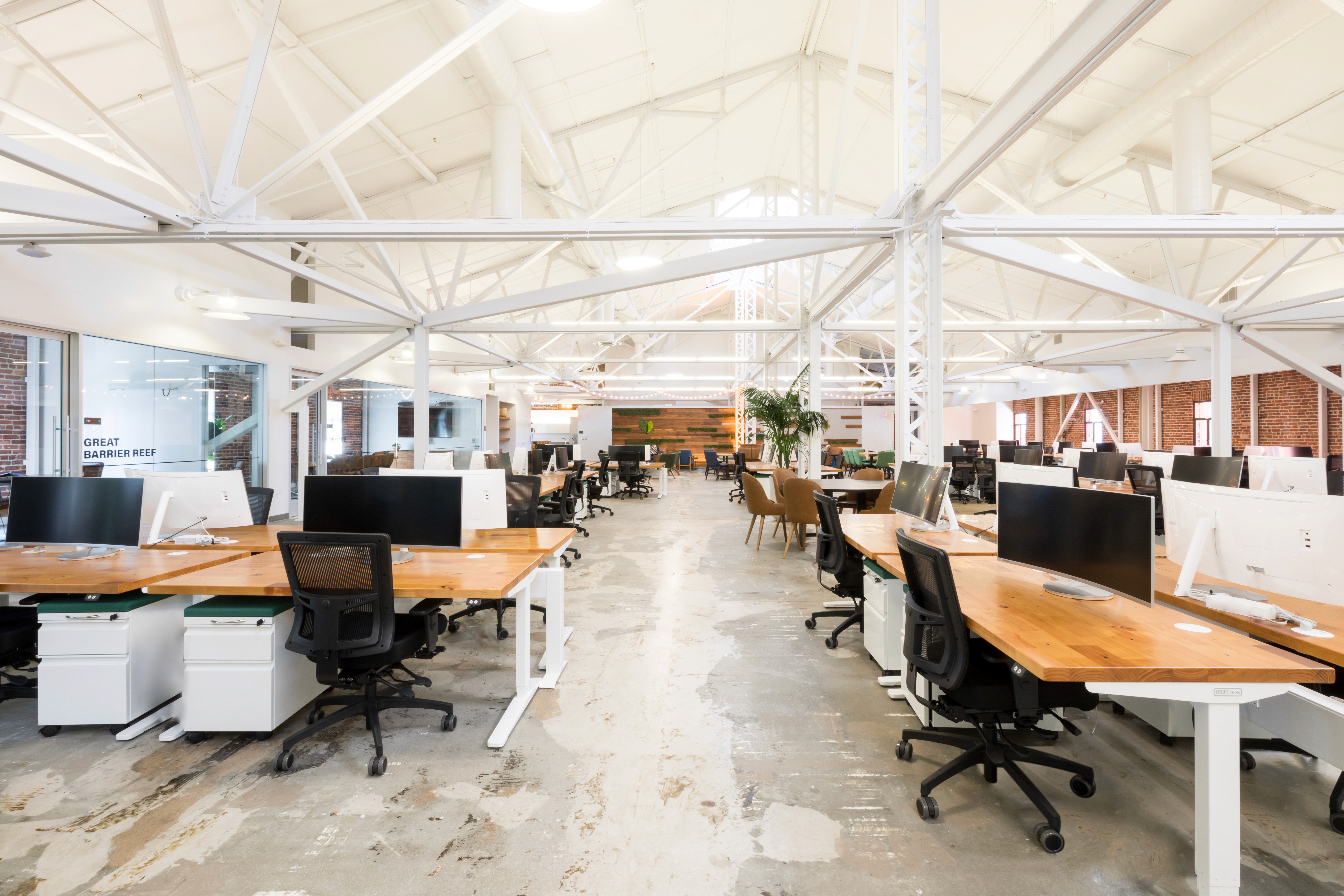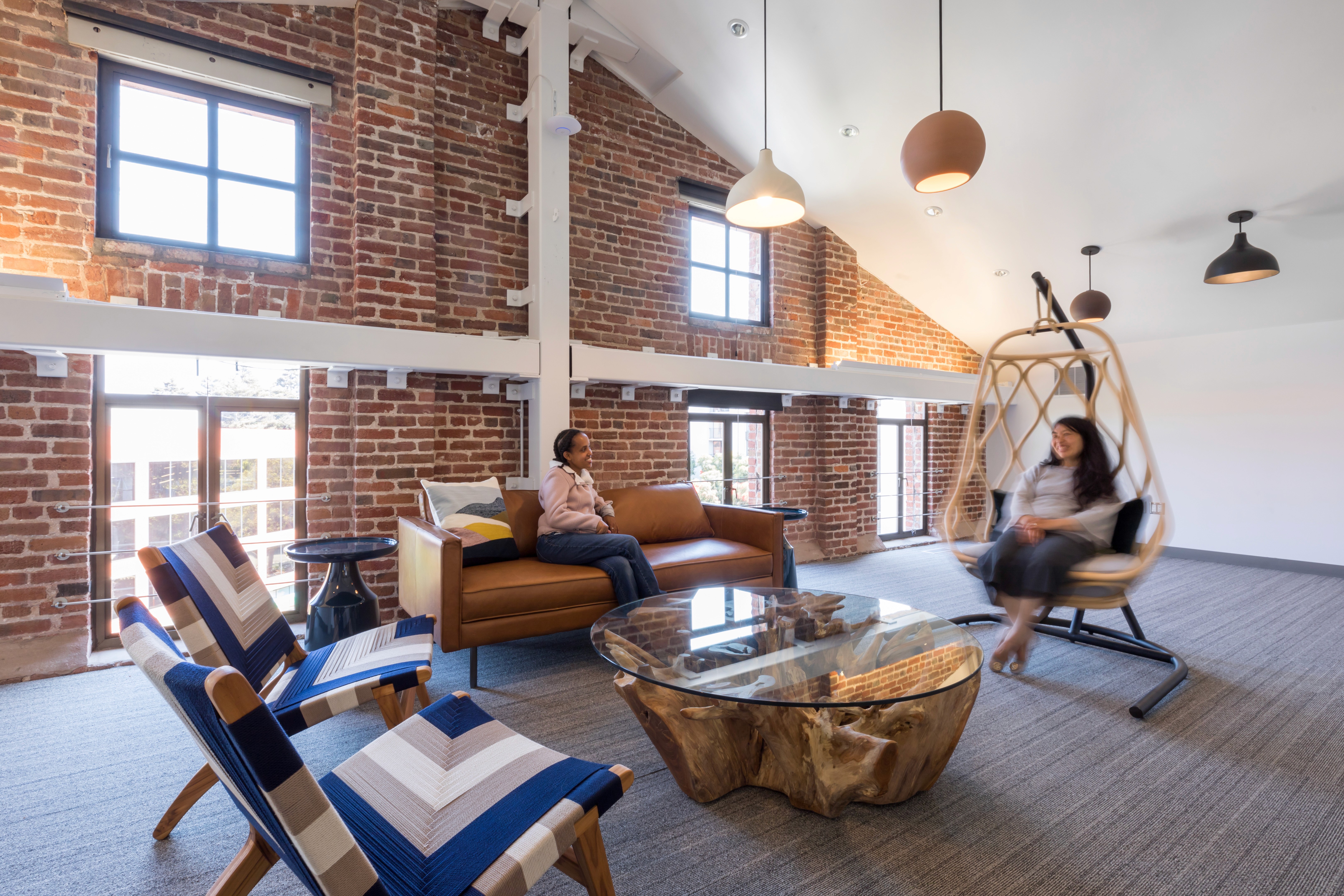 Recycled furniture and sustainable materials are a key component used throughout the workplace and lessen the environmental impact of the project. Existing wall and floor finishes are left intact, reducing construction waste and highlighting the industrial character of the space.