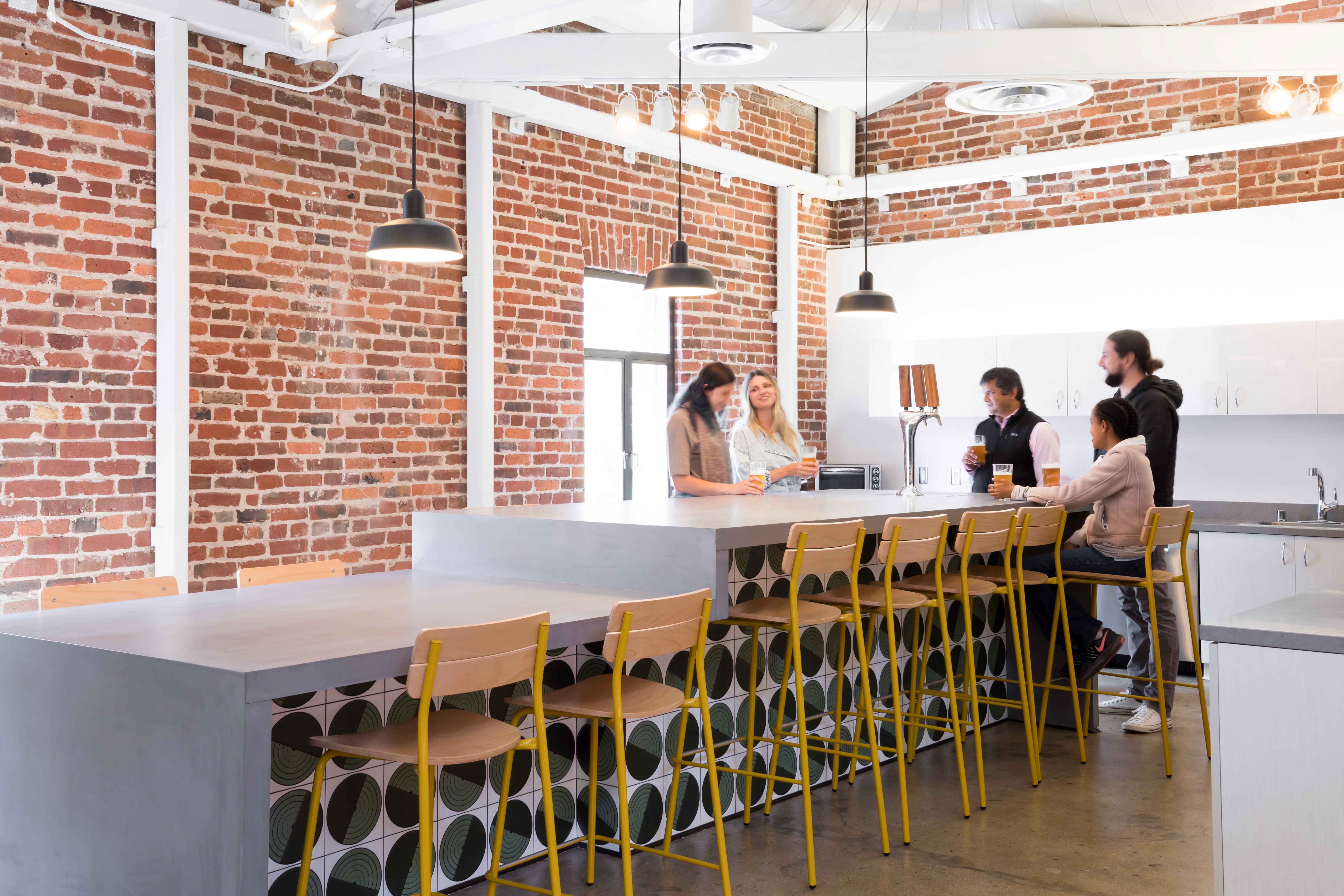 The open plan workstations and breakout zones foster a sense of equality and encourage collaboration among employees. Conference and meeting rooms at the perimeter are differentiated with bright, stimulating colors while a large, centrally placed lounge allows for casual conversation and organic interaction. The lounge is anchored with a large feature wall decorated with preserved greenery and dimensional reclaimed wood paneling. A three-sided fireplace adds ambiance and warmth, enhancing the comfortable residential atmosphere. The breakroom provides an additional zone for interactions, lunches and happy hours. Beer taps and espresso equipment are provided, and a central island of colorful customized tiles with an agricultural-inspired pattern acts as a natural gathering place.