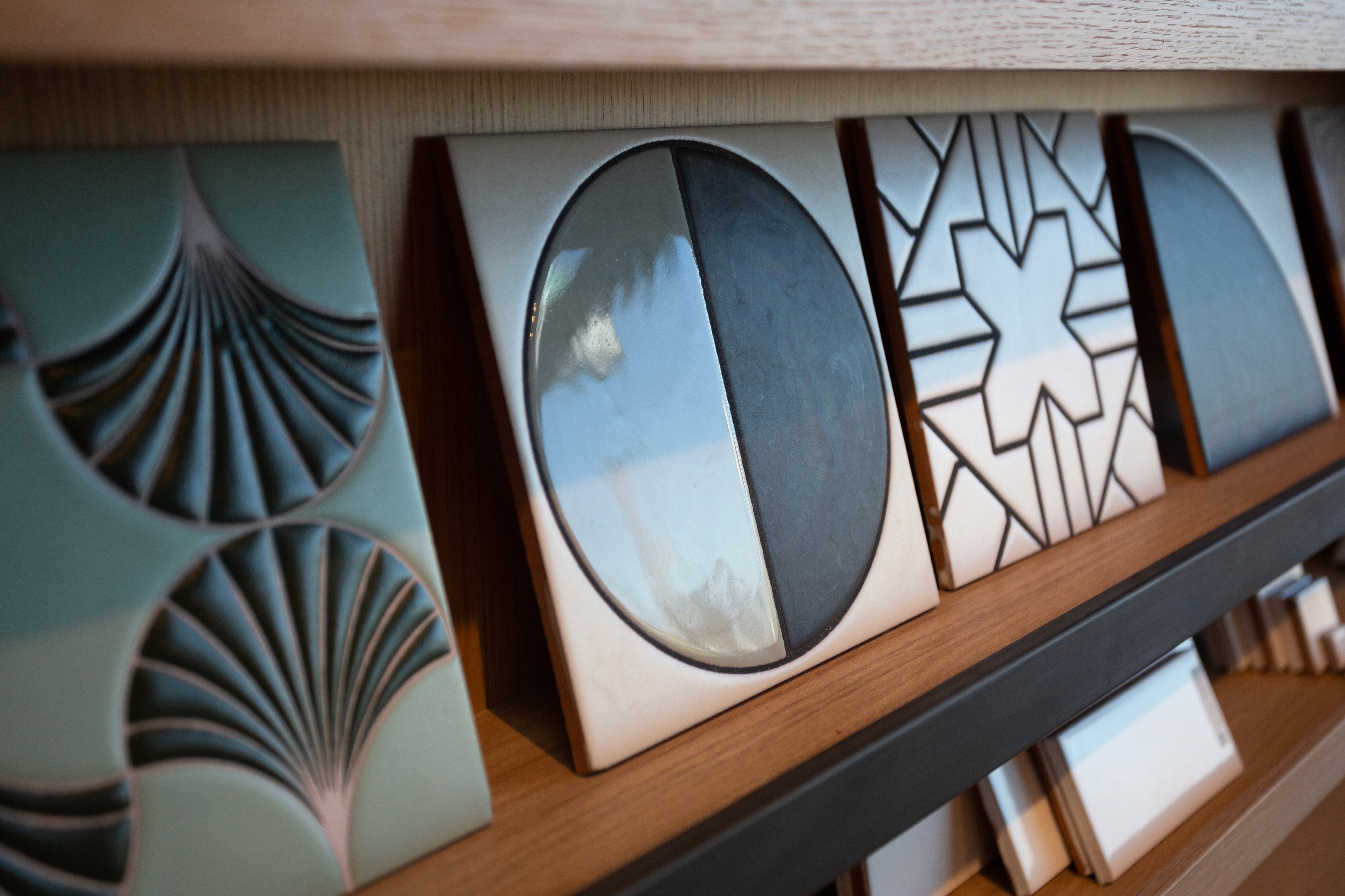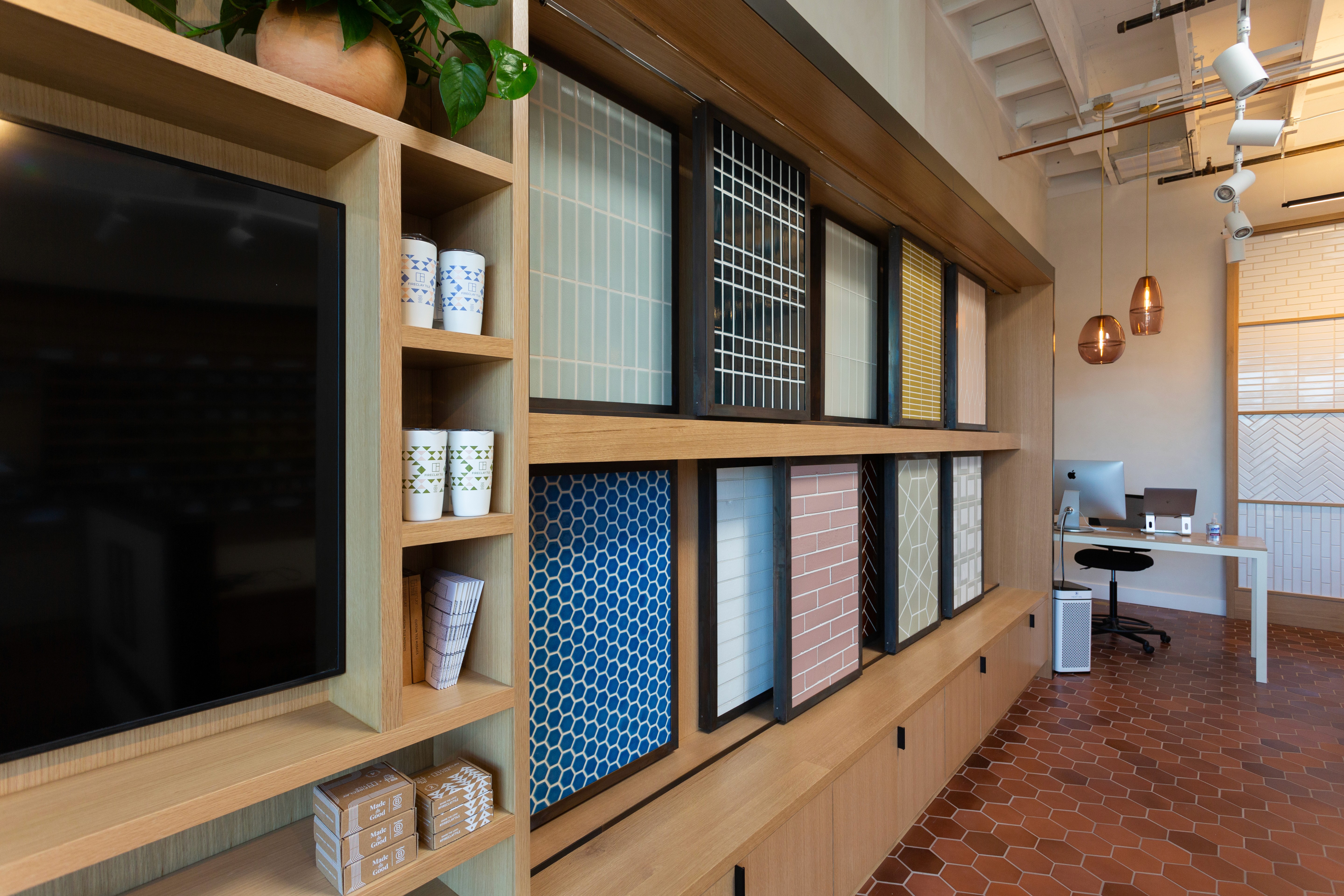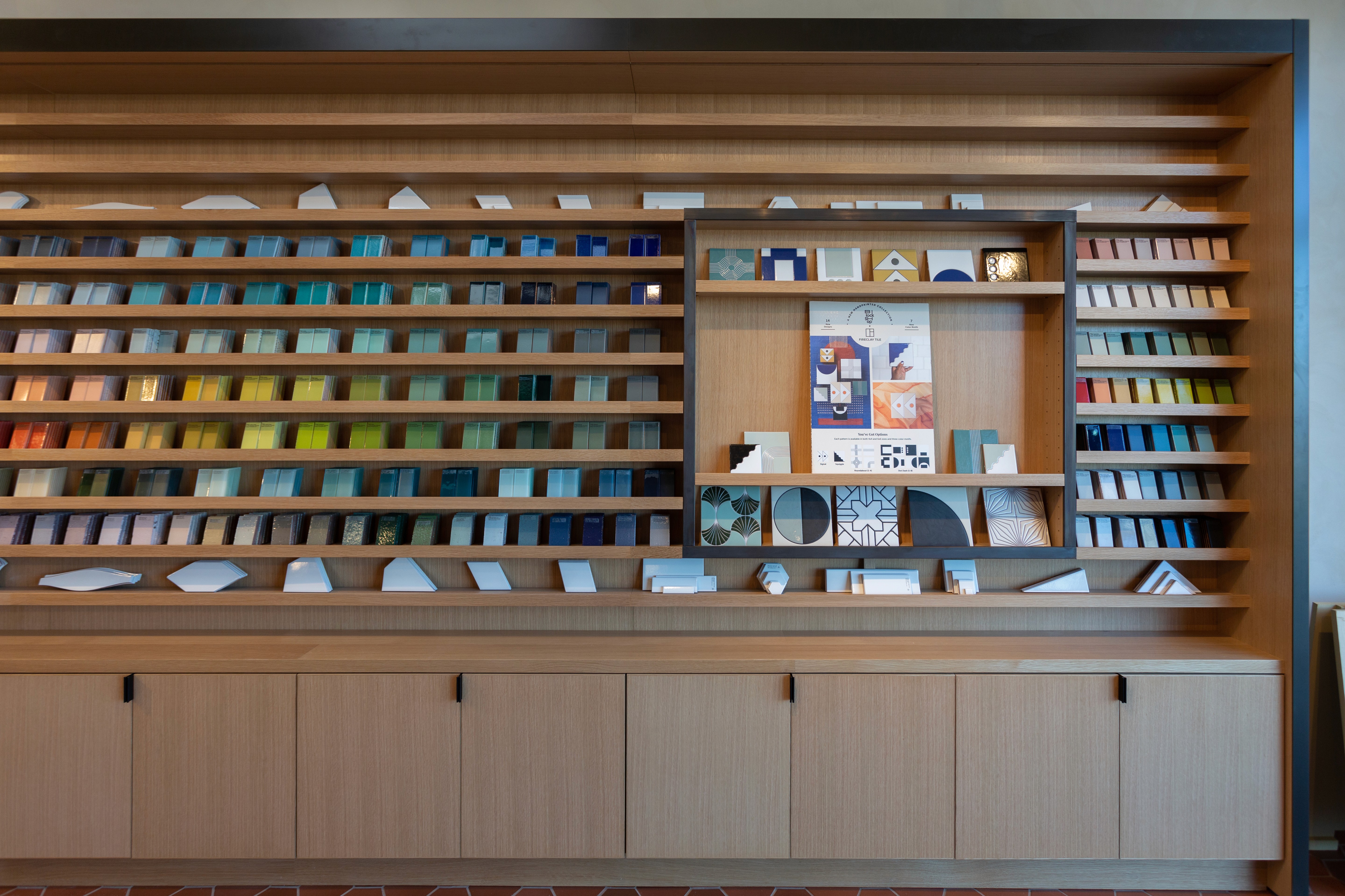 As homeowners, designers, artists, and curious guests enter the showroom, they’ll be instantly greeted by Fireclay’s handmade tiles, all displayed on eye-catching wooden shelving units. Also known as their “color wall,” these shelving units hold all the glazed and glass tile options as well as their current feature collection in collaboration with Block Shop. With the space creating a natural flow, people can admire the tiles and transfer them over to the center table to help bring their home project to life.