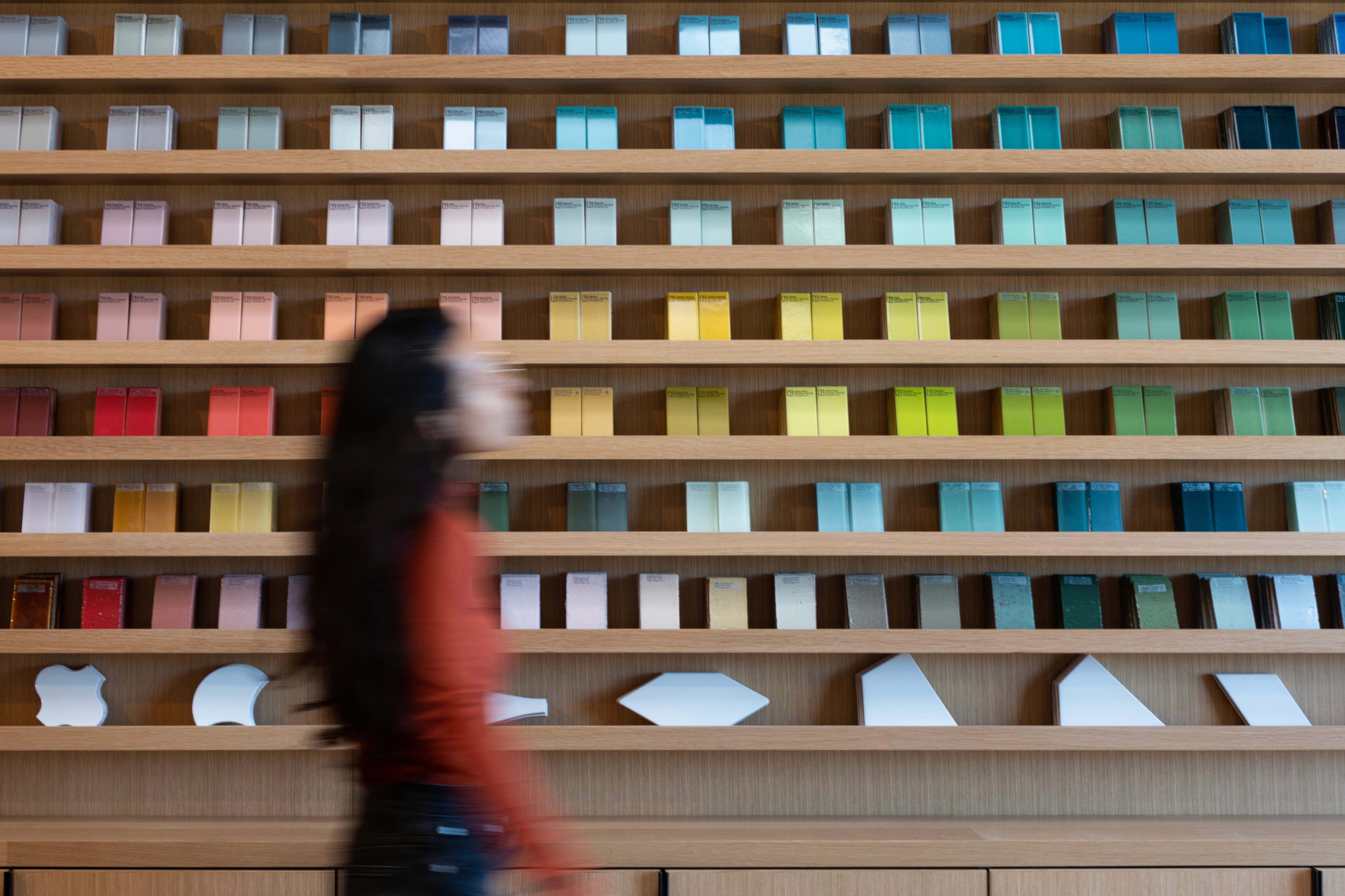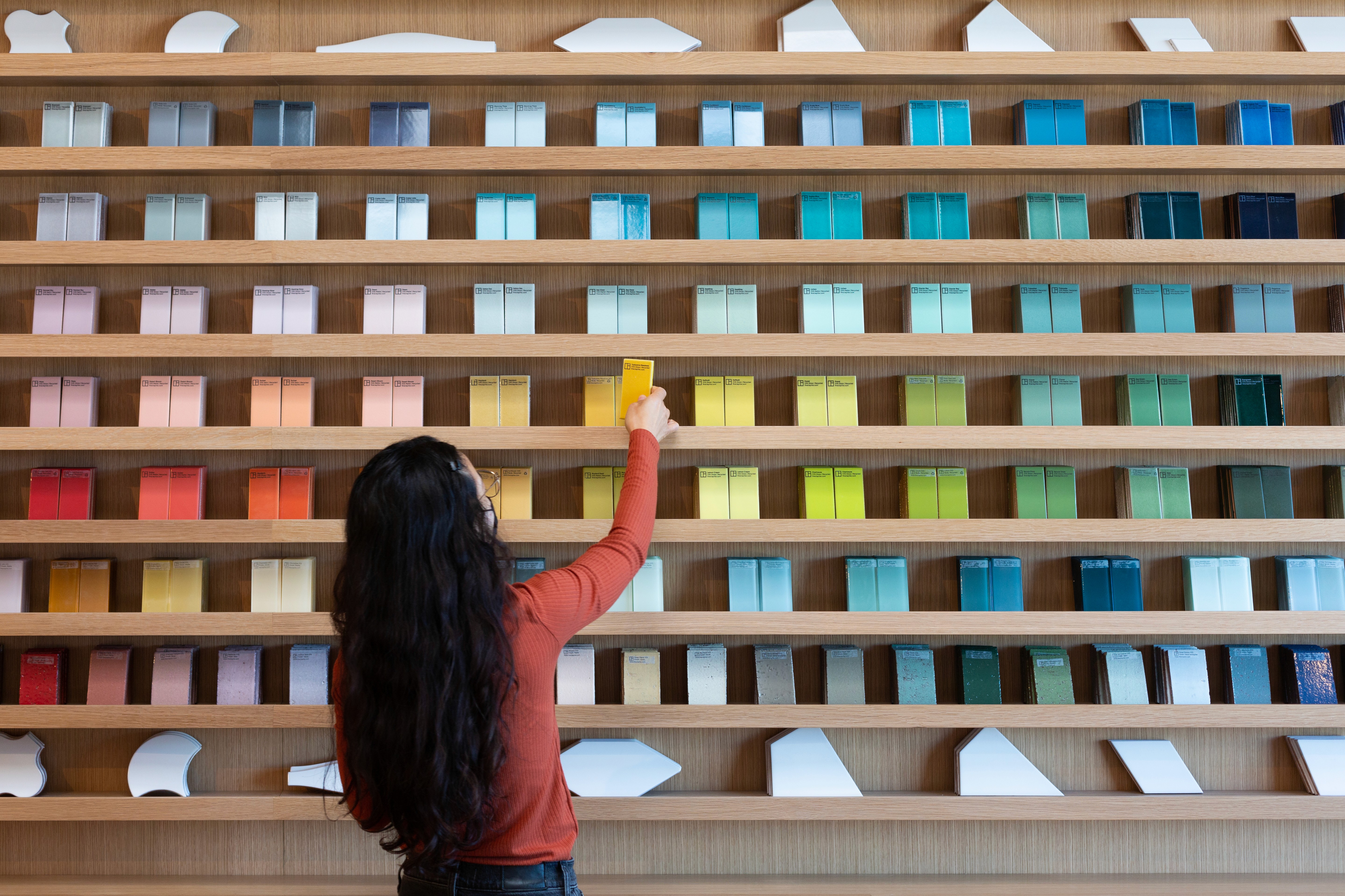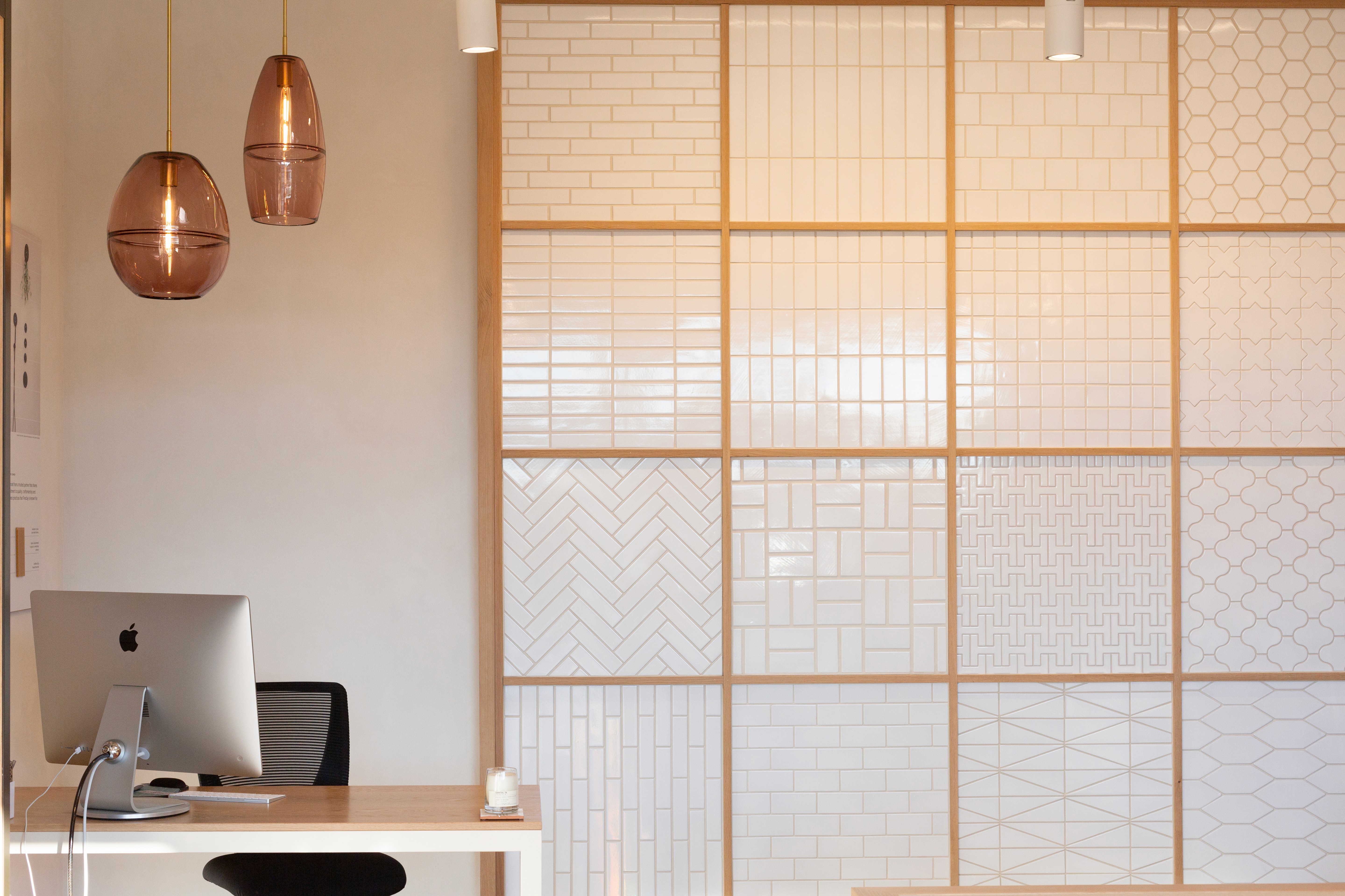 As homeowners, designers, artists, and curious guests enter the showroom, they’ll be instantly greeted by Fireclay’s handmade tiles, all displayed on eye-catching wooden shelving units. Also known as their “color wall,” these shelving units hold all the glazed and glass tile options as well as their current feature collection in collaboration with Block Shop. With the space creating a natural flow, people can admire the tiles and transfer them over to the center table to help bring their home project to life.