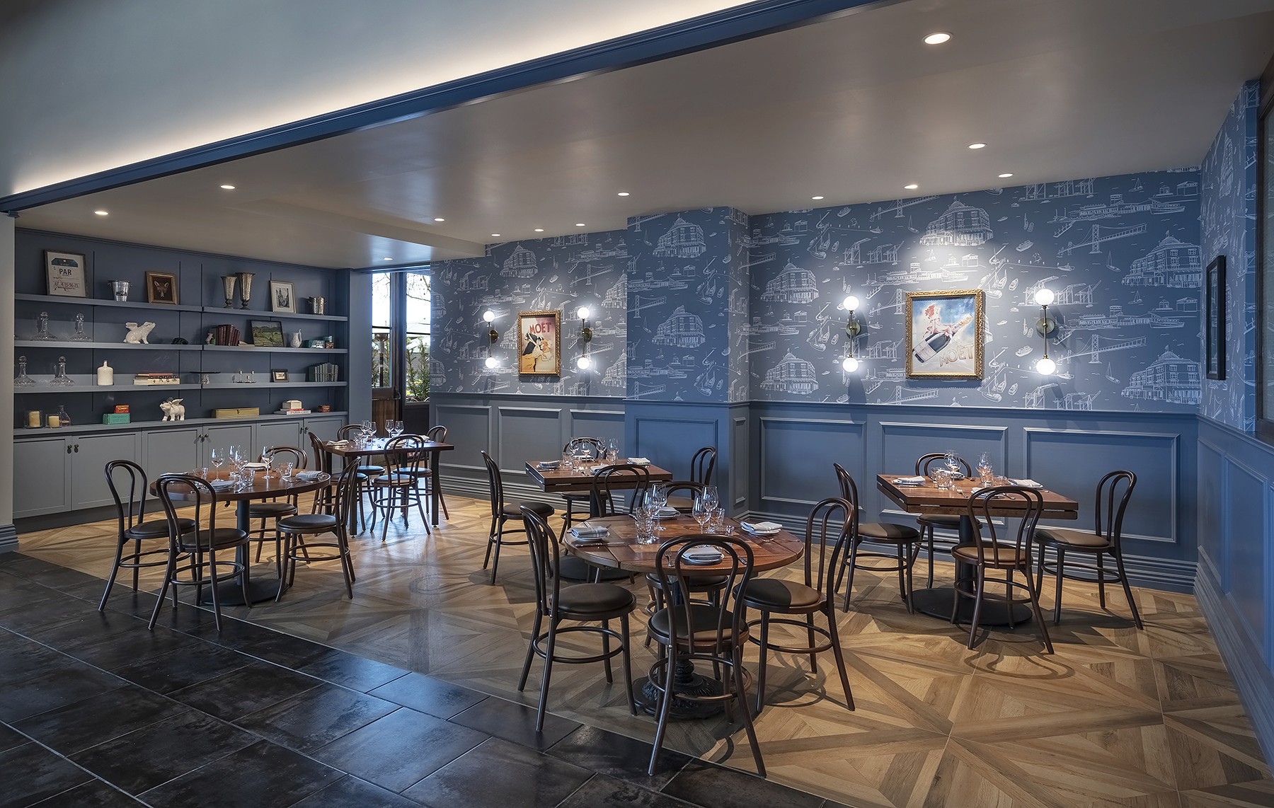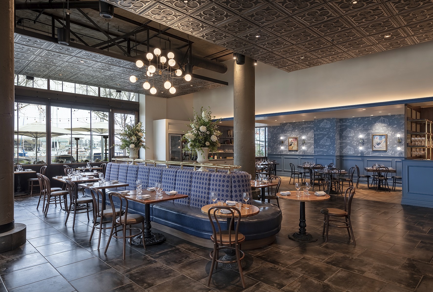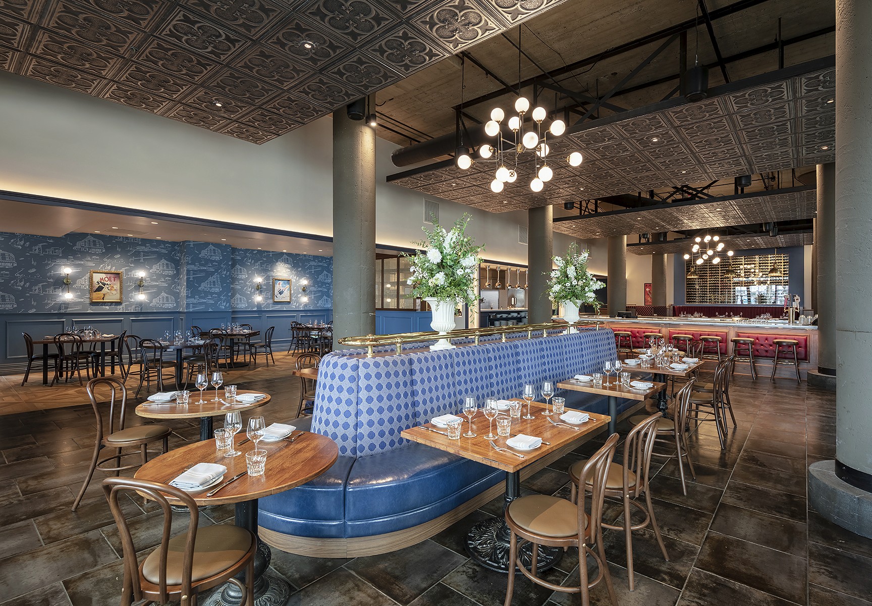 Focusing on maintaining a modern and sophisticated ambiance from morning to night, the Arcsine team intentionally created an authentic French brasserie atmosphere with refined decorative elements spread throughout the space. Left Bank Jack London Square features a rich color palette of French blues and deep reds, accented by antique metal details and decorative tin ceiling paneling.