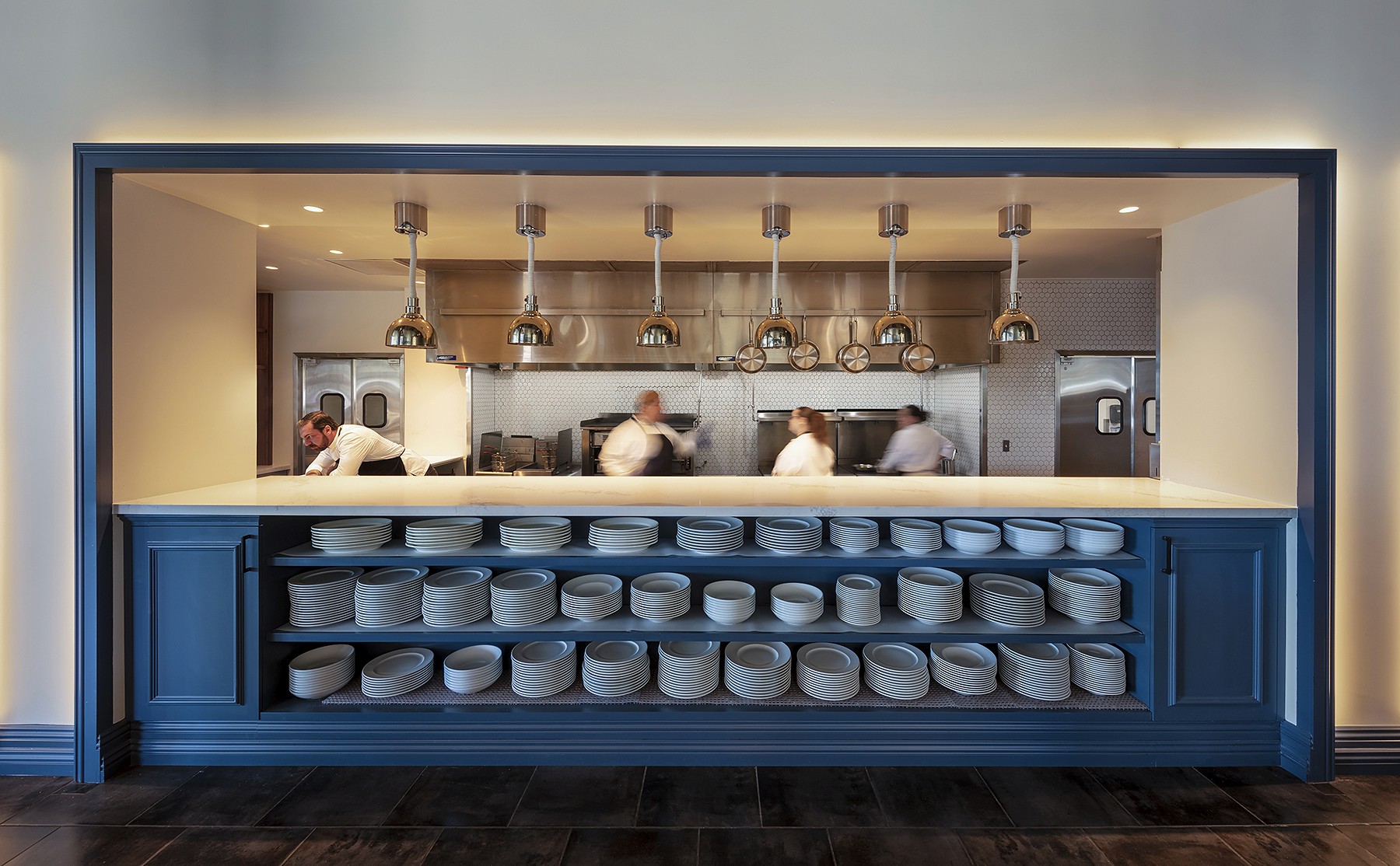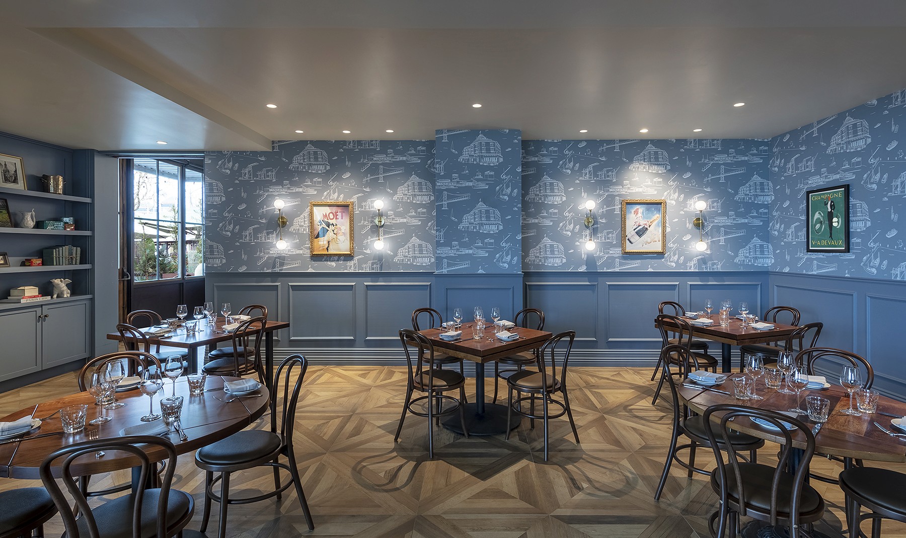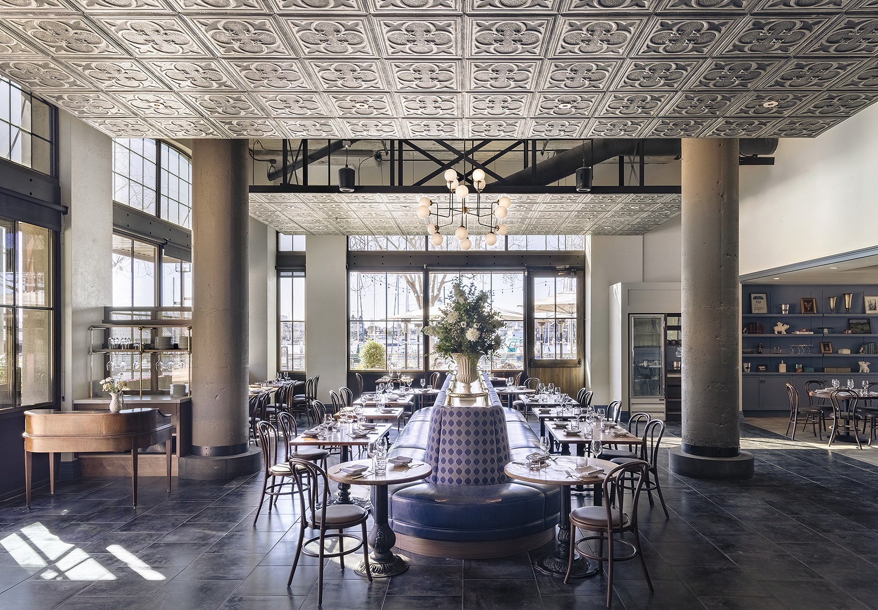 Focusing on maintaining a modern and sophisticated ambiance from morning to night, the Arcsine team intentionally created an authentic French brasserie atmosphere with refined decorative elements spread throughout the space. Left Bank Jack London Square features a rich color palette of French blues and deep reds, accented by antique metal details and decorative tin ceiling paneling.