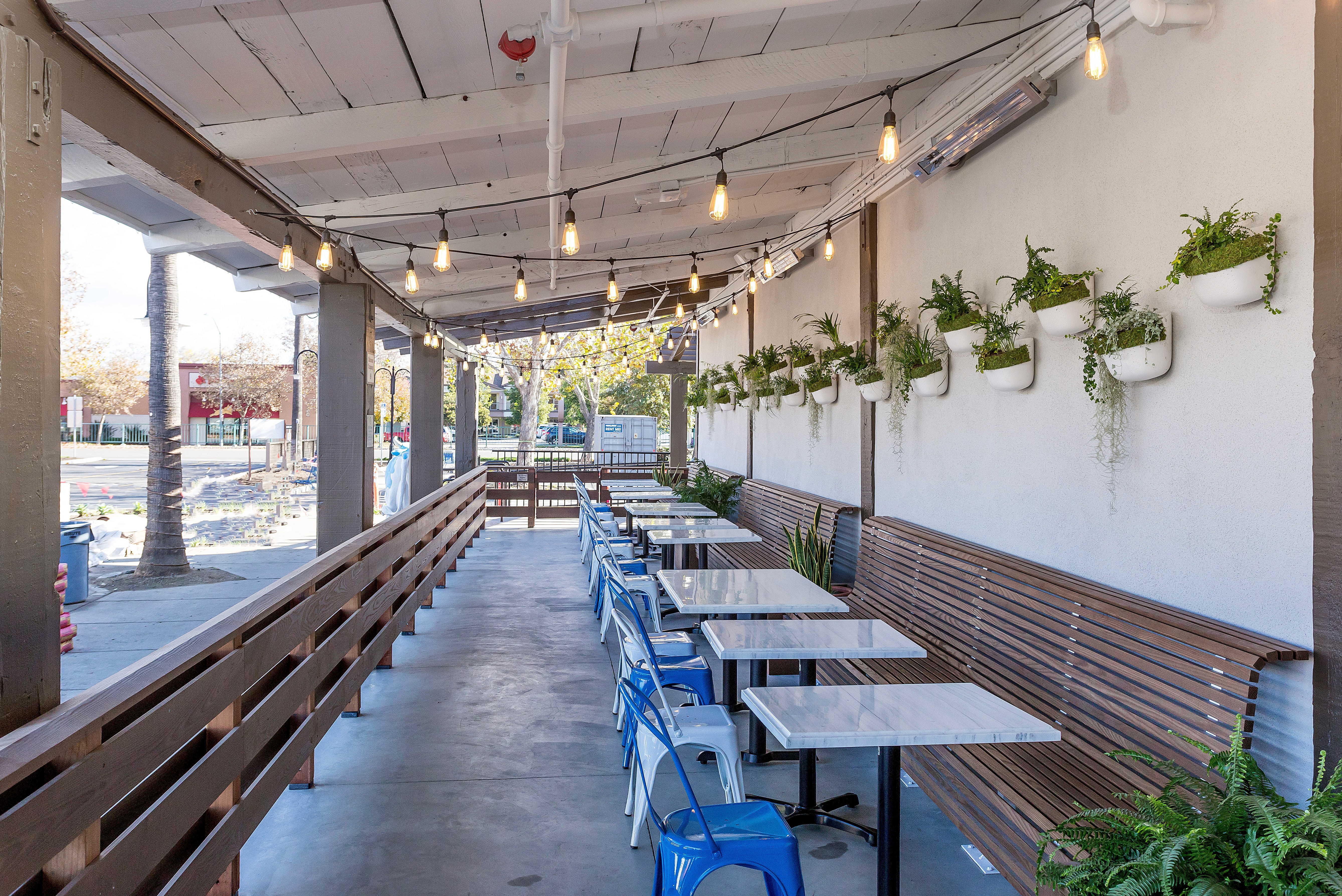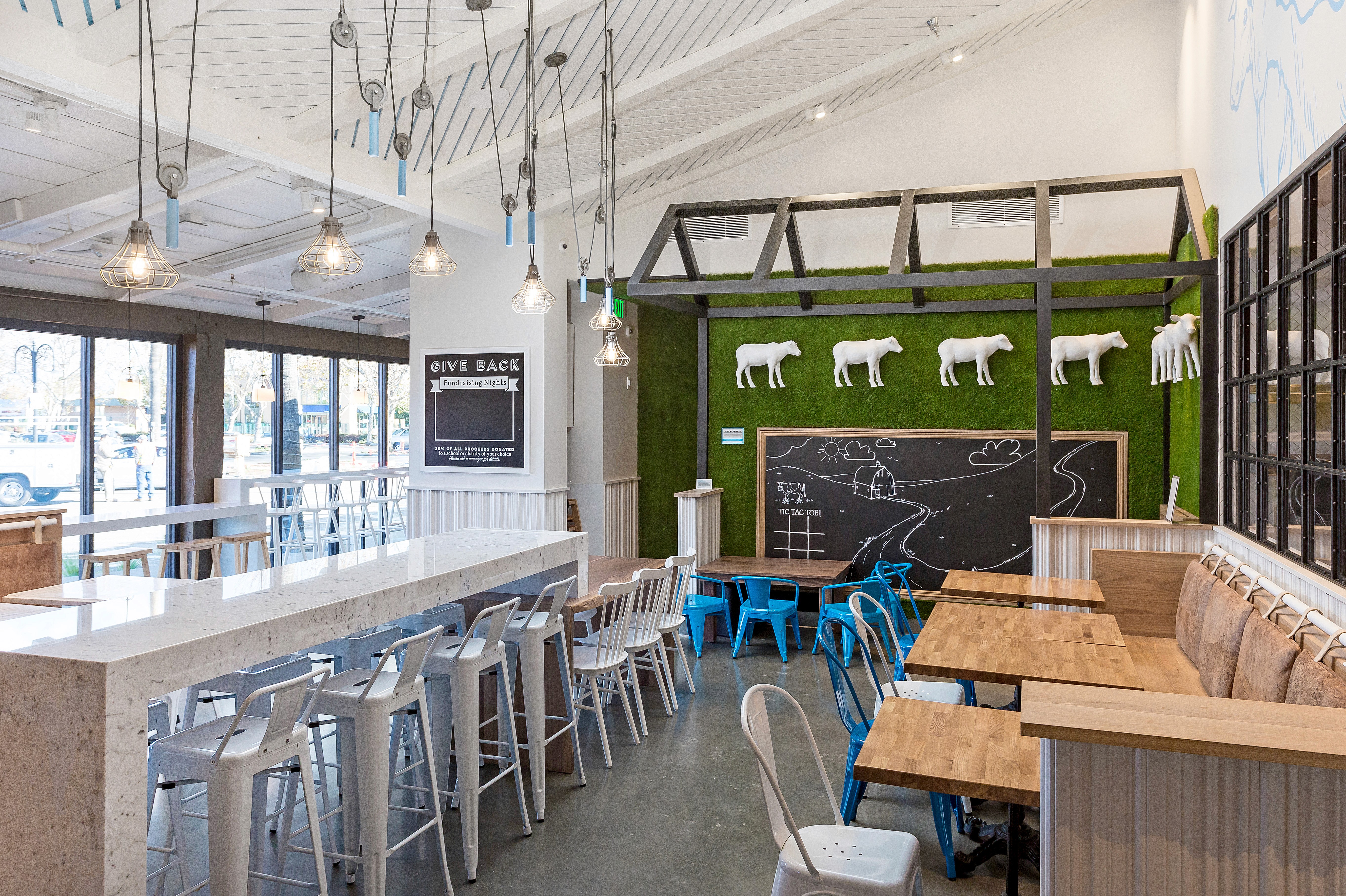 In the main dining area, guests have the option to sit in more intimate banquette seating or counter height communal tables. Below the mural are inset glass panels framed in industrial blackened metal, allowing a peek into the kitchen. The panels have various glass types – chicken wire glass, ribbed glass, and dotted glass. This style of glass is seen again at the kitchen window and also as a barrier between the l-shaped banquette seating and the ordering area. Having these glass panels in the middle of the space blurs the boundaries between indoor and outdoor, similar to a farmhouse.