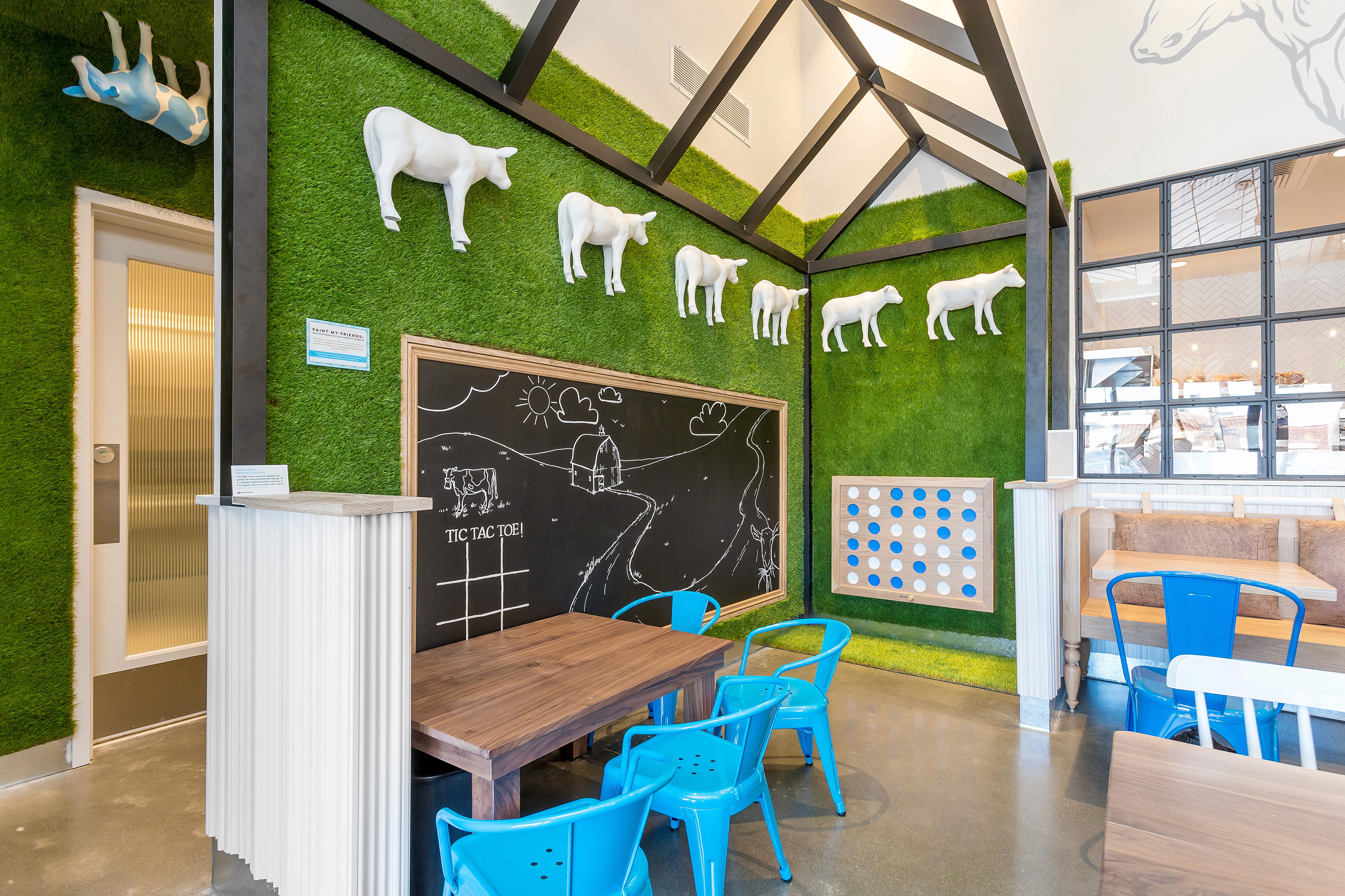 A family-friendly environment was very important to the client, so a corner of the dining area is dedicated to kid’s activities. This area has a metal barn shaped structure and AstroTurf wallcovering and flooring, distinguishing the kid’s area from the main area and continuing the indoor/outdoor theme.