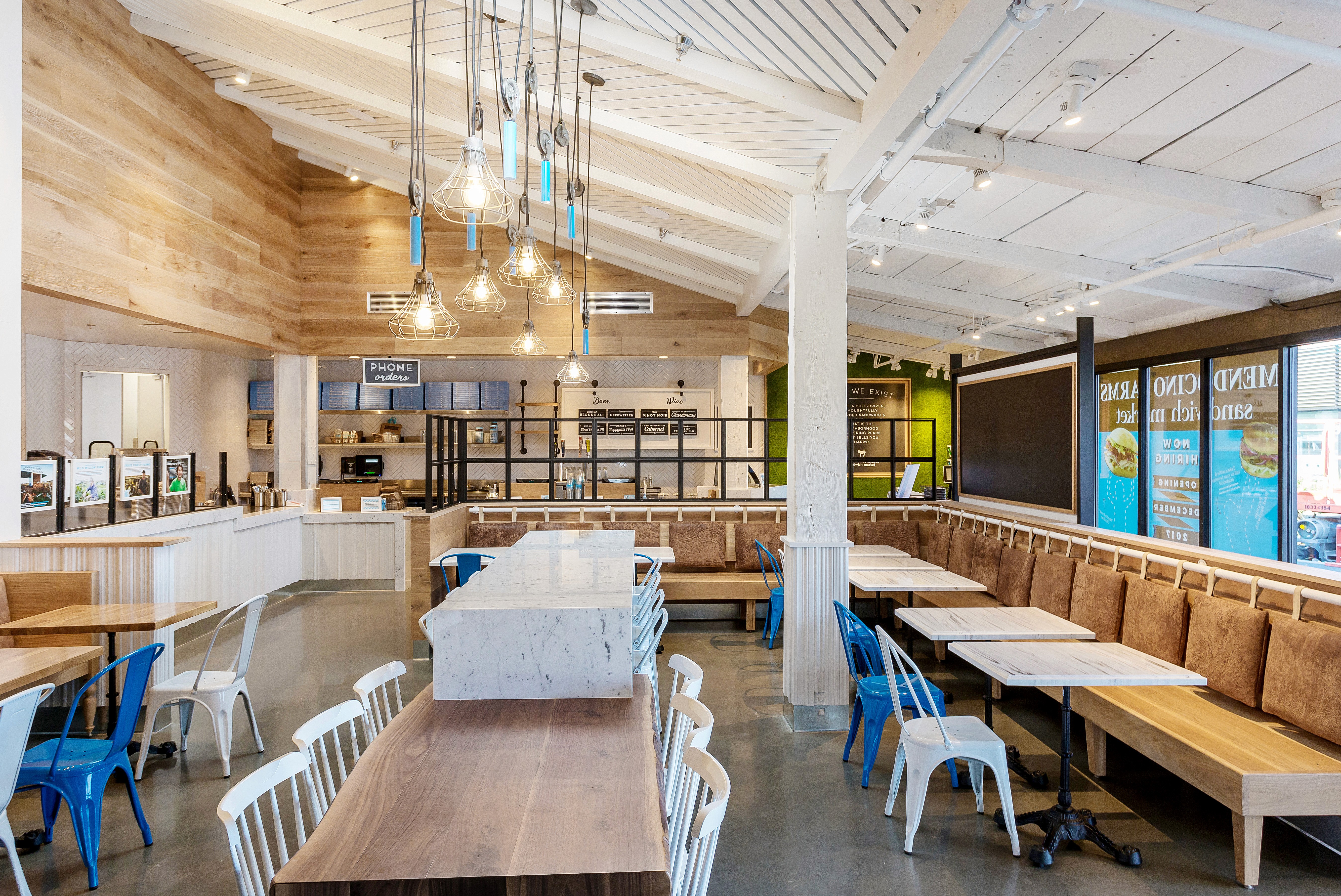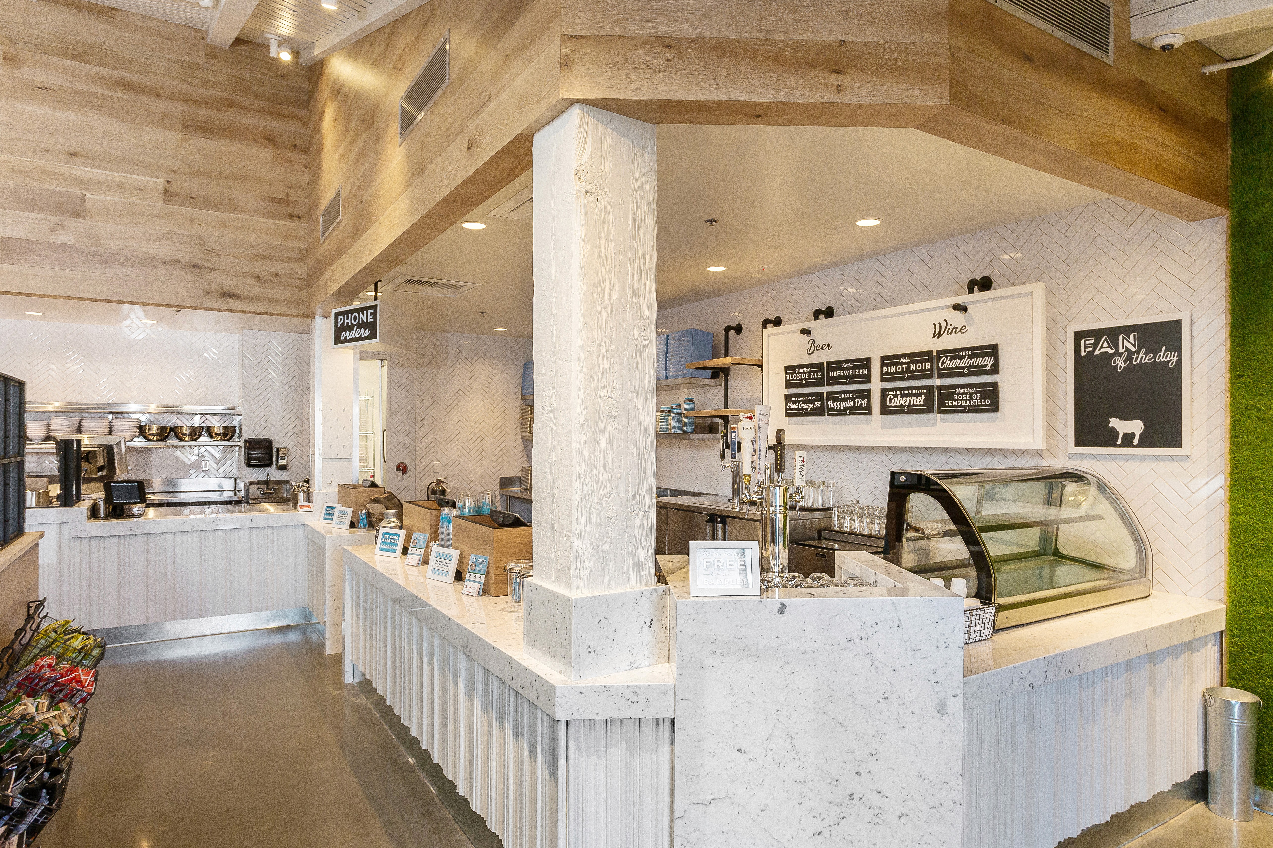 Mendocino Farms plays on a “Napa farmhouse” theme – a modern, fresh take on the farmhouse style. The color palette consists of soft gray, white and wood tones with pops of bright blue. As guests enter they can pick up a paper menu or check out the large custom menu mounted on the floor-to-ceiling metal stand. While waiting to order they can grab a beverage or sample a dish. The point of sale counter features a white Carrara marble top, siding composed of decorative wood crown molding installed vertically, and white herringbone tile on the back wall. The point of sale area turns into an L-shape and becomes an open-concept kitchen.