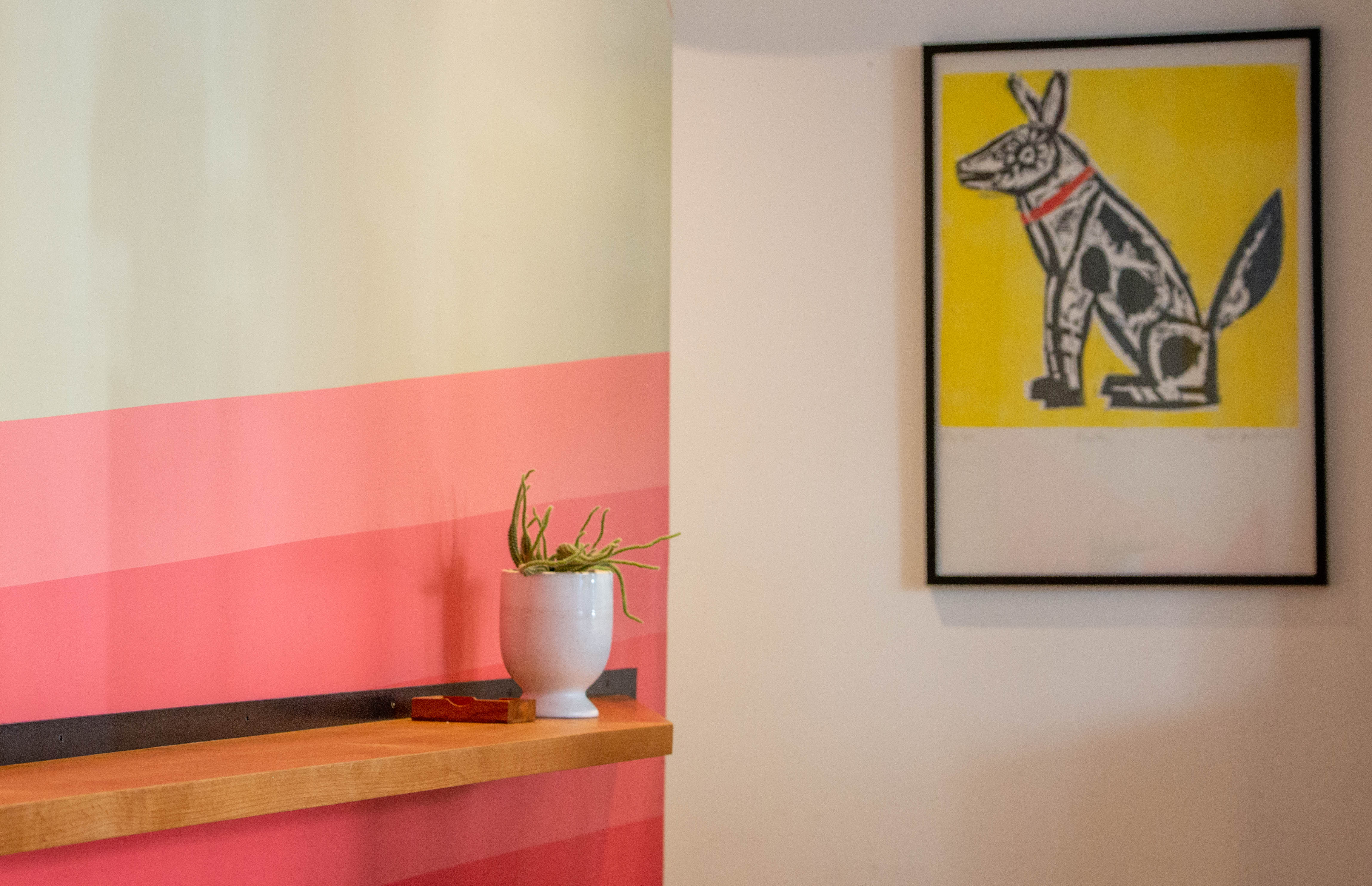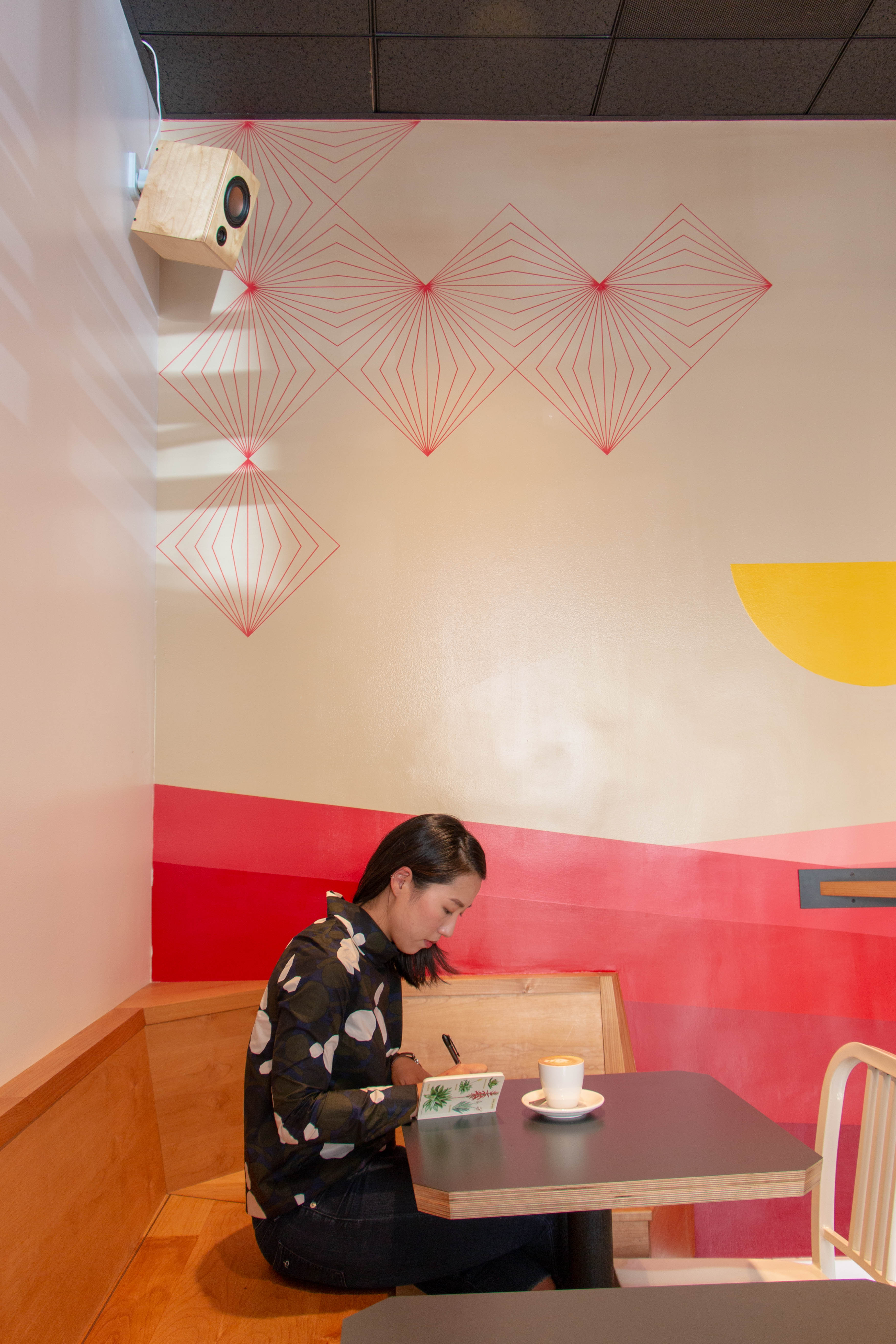 Additionally, Arcsine placed graphic tiles on the first level floor and wall, drawing the eye in from the street and up to light fixtures that zigzag across the ceiling amidst suspended wireframe sculptures. Local artwork creates a playful, but curated atmosphere, which echoes the strategy for seating in the shop. Looking to encourage informal and chance conversation, a number of intersecting counters, made of wood and steel, extend around the store and provide a variety of seating choices to perch and chat over coffee.