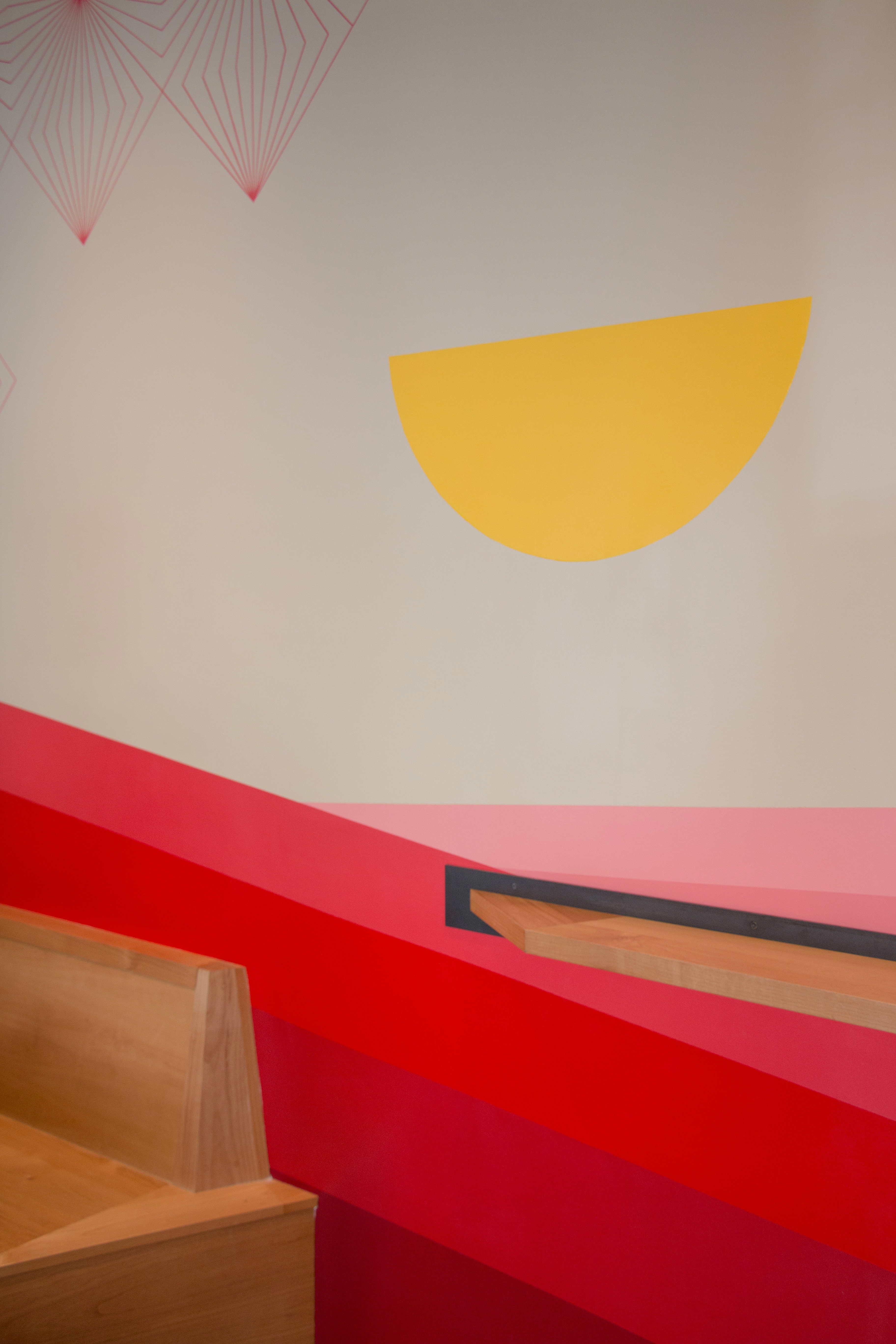 Additionally, Arcsine placed graphic tiles on the first level floor and wall, drawing the eye in from the street and up to light fixtures that zigzag across the ceiling amidst suspended wireframe sculptures. Local artwork creates a playful, but curated atmosphere, which echoes the strategy for seating in the shop. Looking to encourage informal and chance conversation, a number of intersecting counters, made of wood and steel, extend around the store and provide a variety of seating choices to perch and chat over coffee.