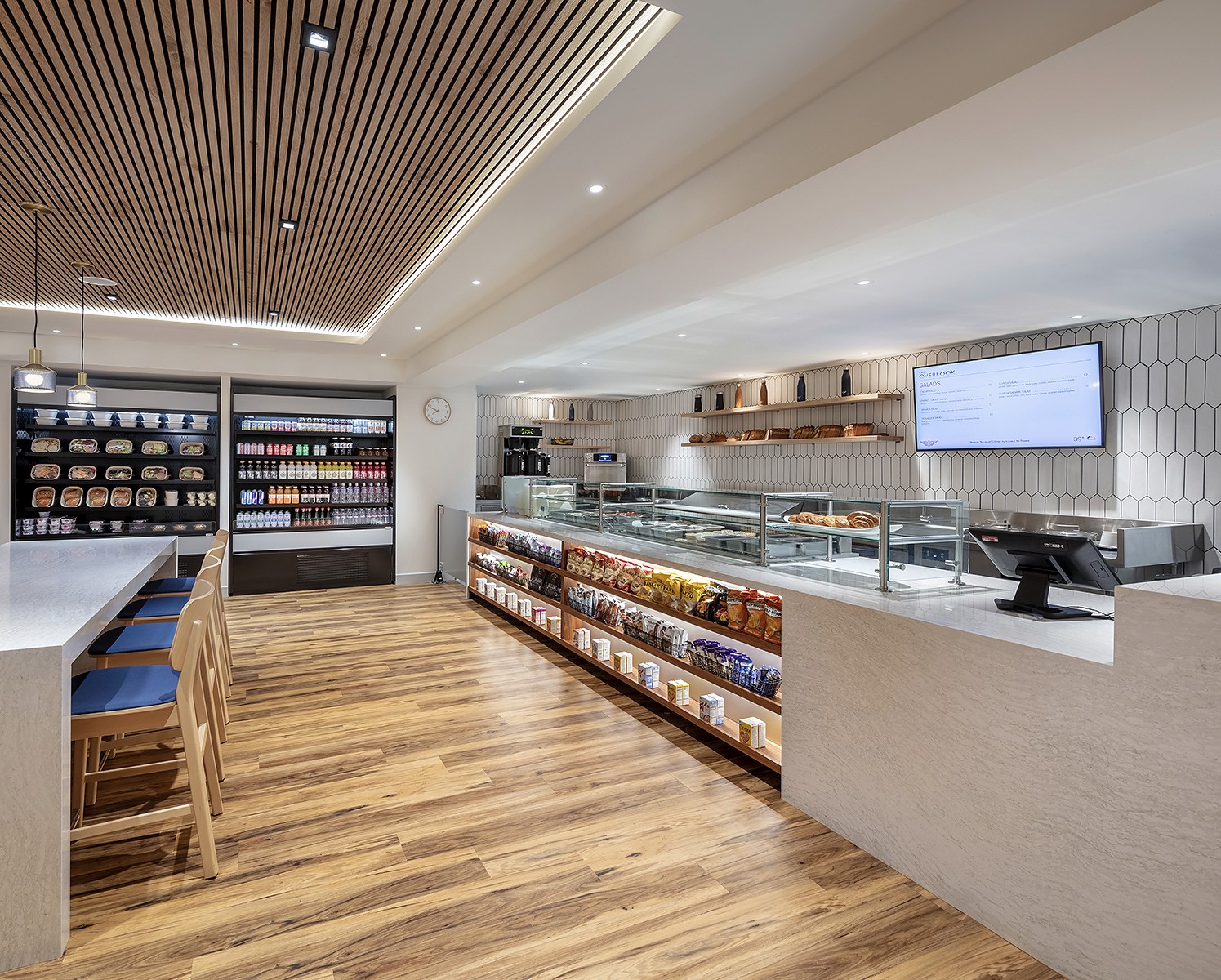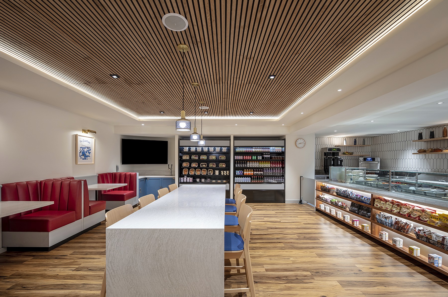 Overlook Café provides ample seating fit for any occasion including counter-seating equipped with outlets, communal high-top tables, movable C-shaped tables, and a coworking nook area with coffee tables. The elegant wooden ceiling, adorned with narrow strips of dark natural wood, blocks out any sound amplified by the swimming pool with acoustic felt and wooden veneers.