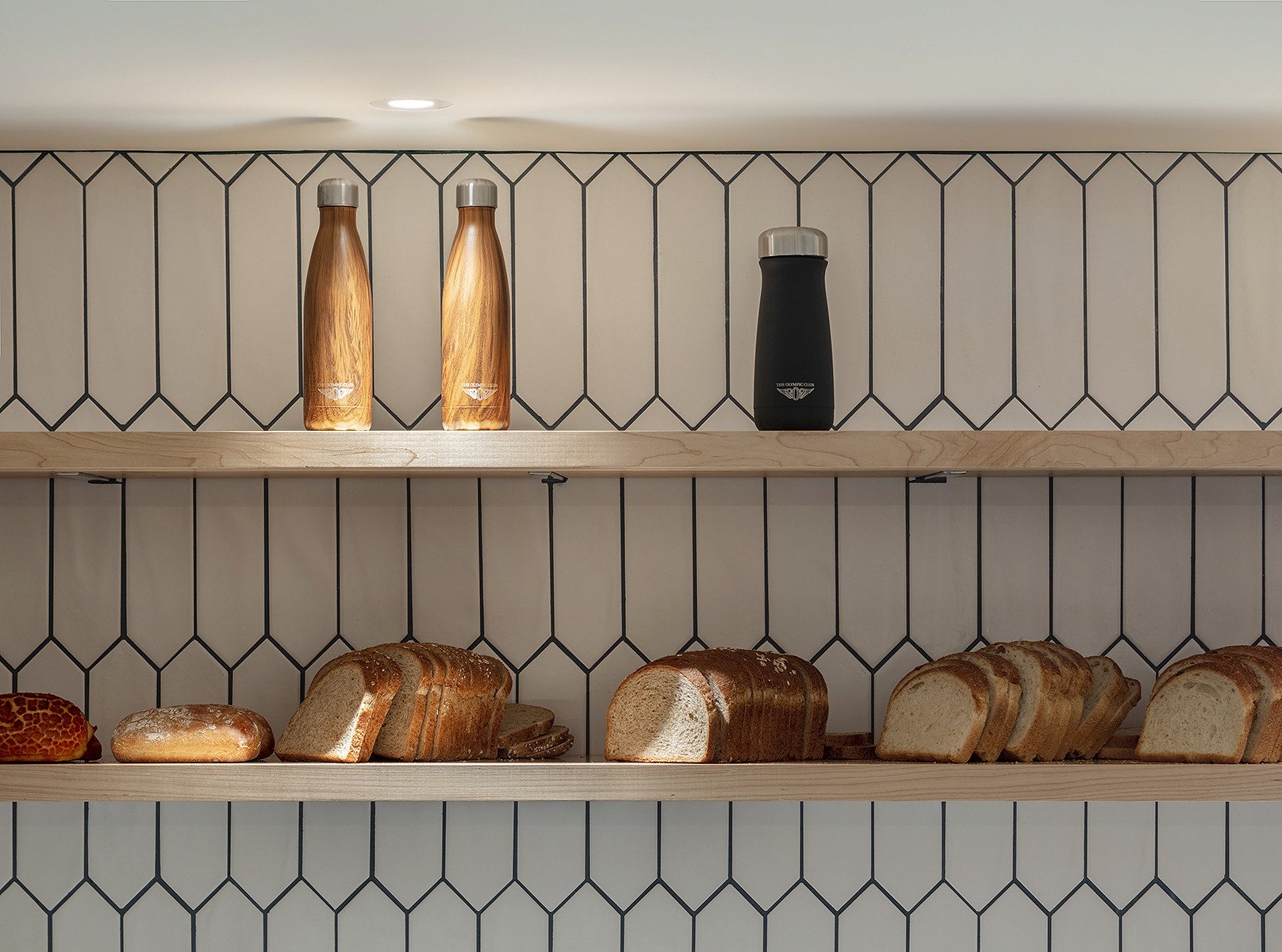 The café’s logo—with the light blue-accentuated bottom of the letters playfully depicted as being half-submerged in water—along with a framed vintage club flag greets guests as they enter in the brightly lit space. Overlooking the club’s swimming pool, the multipurpose space features bold yet classic aesthetics such as white picket tiles from Statement Tile and luxury vinyl tile flooring from Reward. Original decorative posters from past sporting events at The Olympic Club provide a sense of artistic whimsy among the sleek furniture and chic elements. The red button-tufted banquettes and leather lounge booths, custom-made by B&L Seating, contrast with the café’s aqua and neutral tones, contributing to a glamour perfectly tailored to contemporary tastes. Accommodating a total number of 81 people, the café provides effortless comfort and ease.