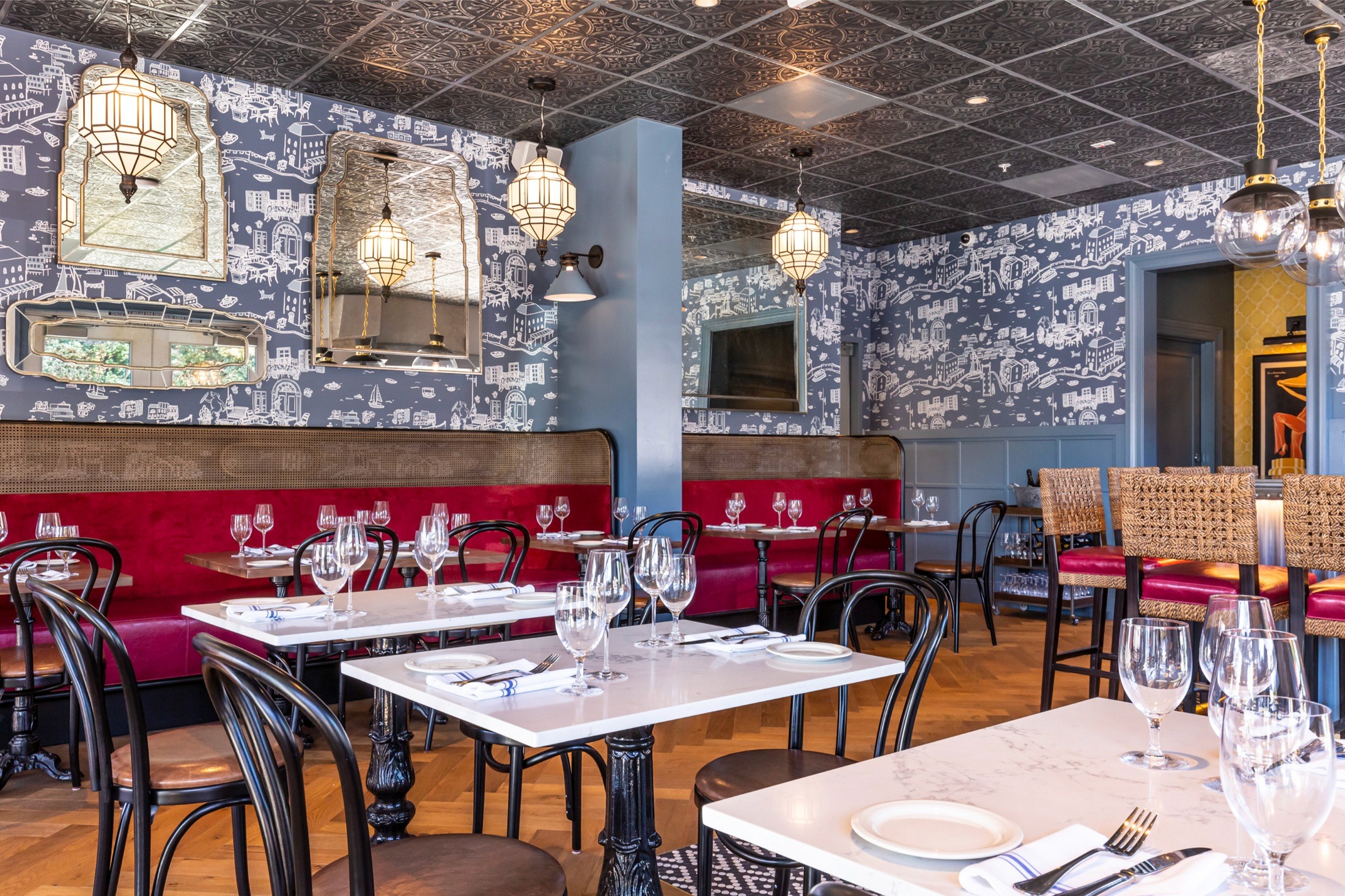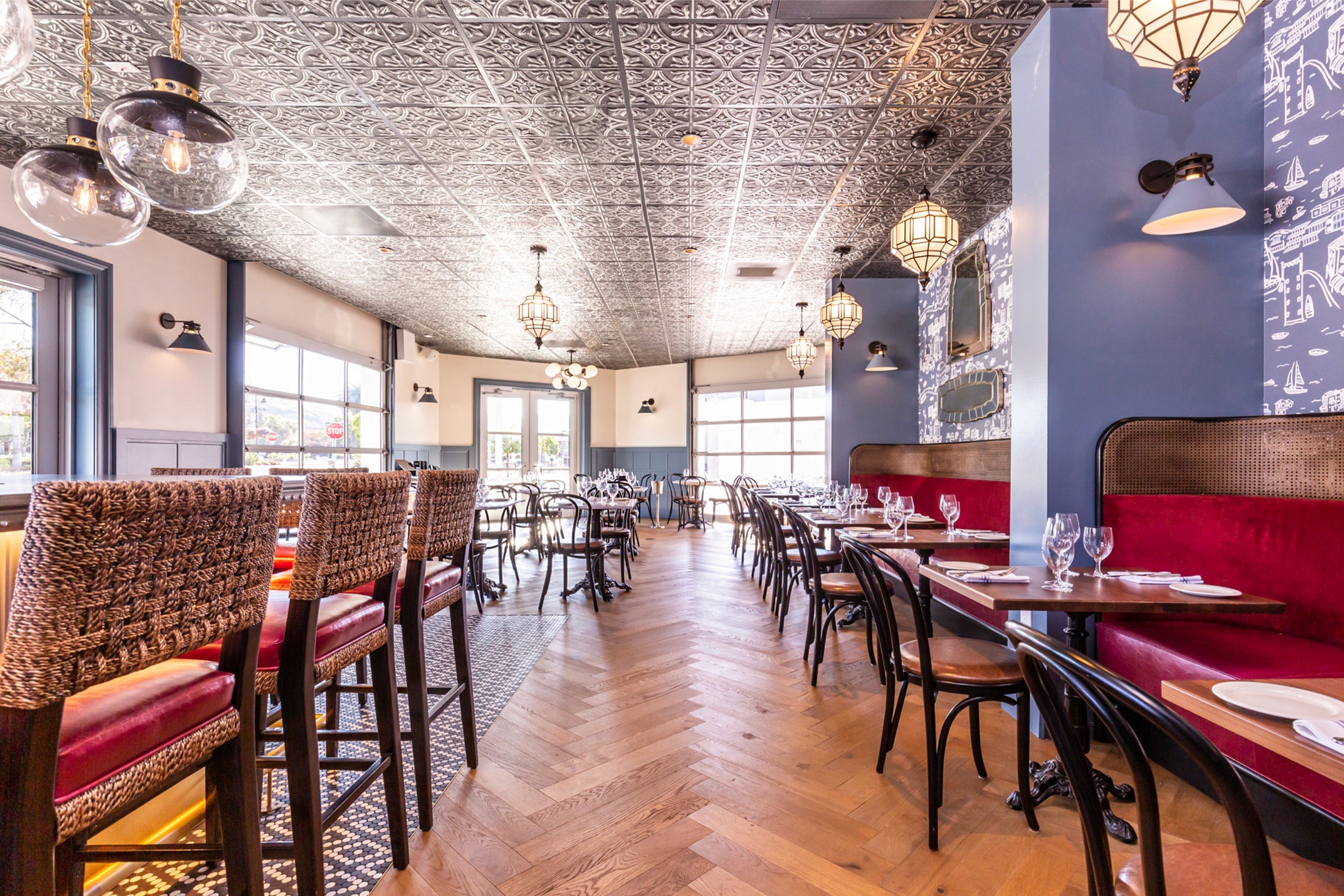Focusing on maintaining a vibrant ambiance from morning to night, the Arcsine team intentionally created a playful bistro atmosphere with refined decorative elements spread throughout the space. At just 1,700 square feet with 65 seats total, Petite Left Bank evokes a jewel box—covered in a rich color palette of French blues and deep reds accented by antique metal details. The effortlessly French yet Californian atmosphere transports guests to an authentic French café where the vibe of the indoor restaurant and bar bleeds out onto the patio. Authentic, French Bistro elements such as wood bistro chairs, a pewter bar top, vintage antique mirrors and herringbone wood flooring provide an elegant yet whimsical theme. Black and white accent tiles at the entrance and in the bar area weave in a modern, chic vibe throughout the space. When guests look up, they will notice a detailed ceiling covered in tin acoustic panels, a classic French motif found in many brasseries. With the space’s proximity to the water and the importance of the Left Bank theme, Arcsine ensured an effortless transition from the indoor space to the outdoor patio incorporating the building’s garage doors in their design.