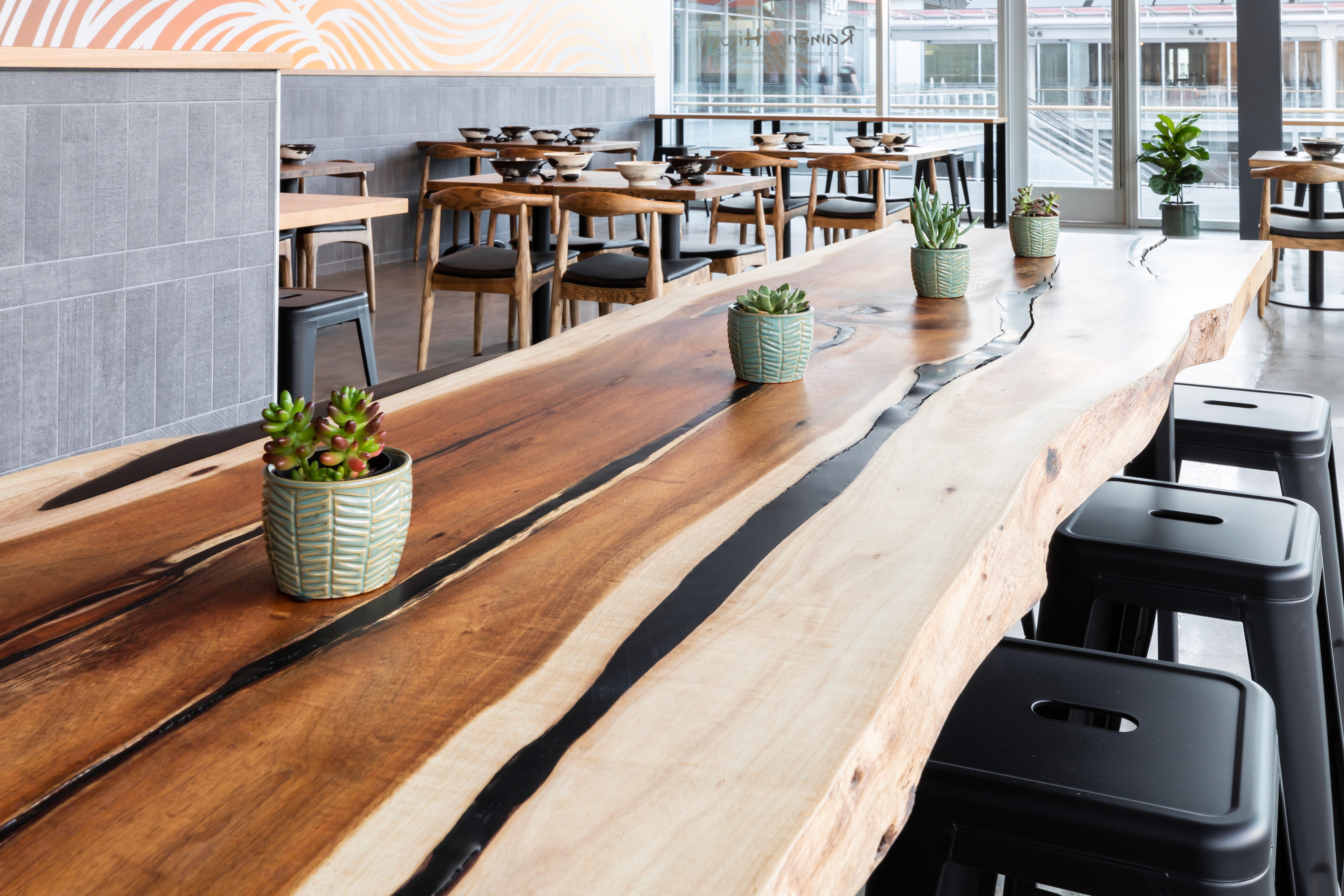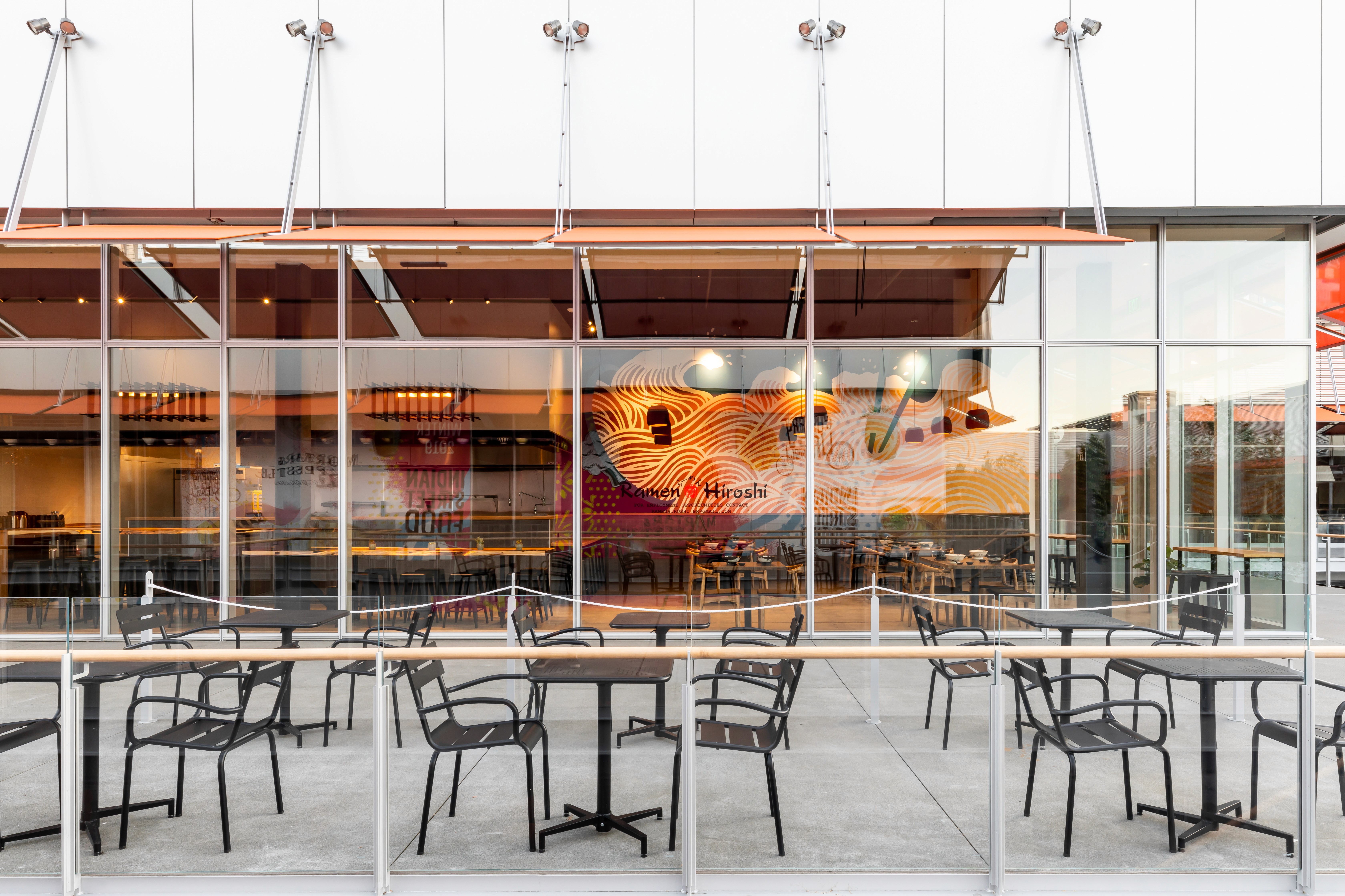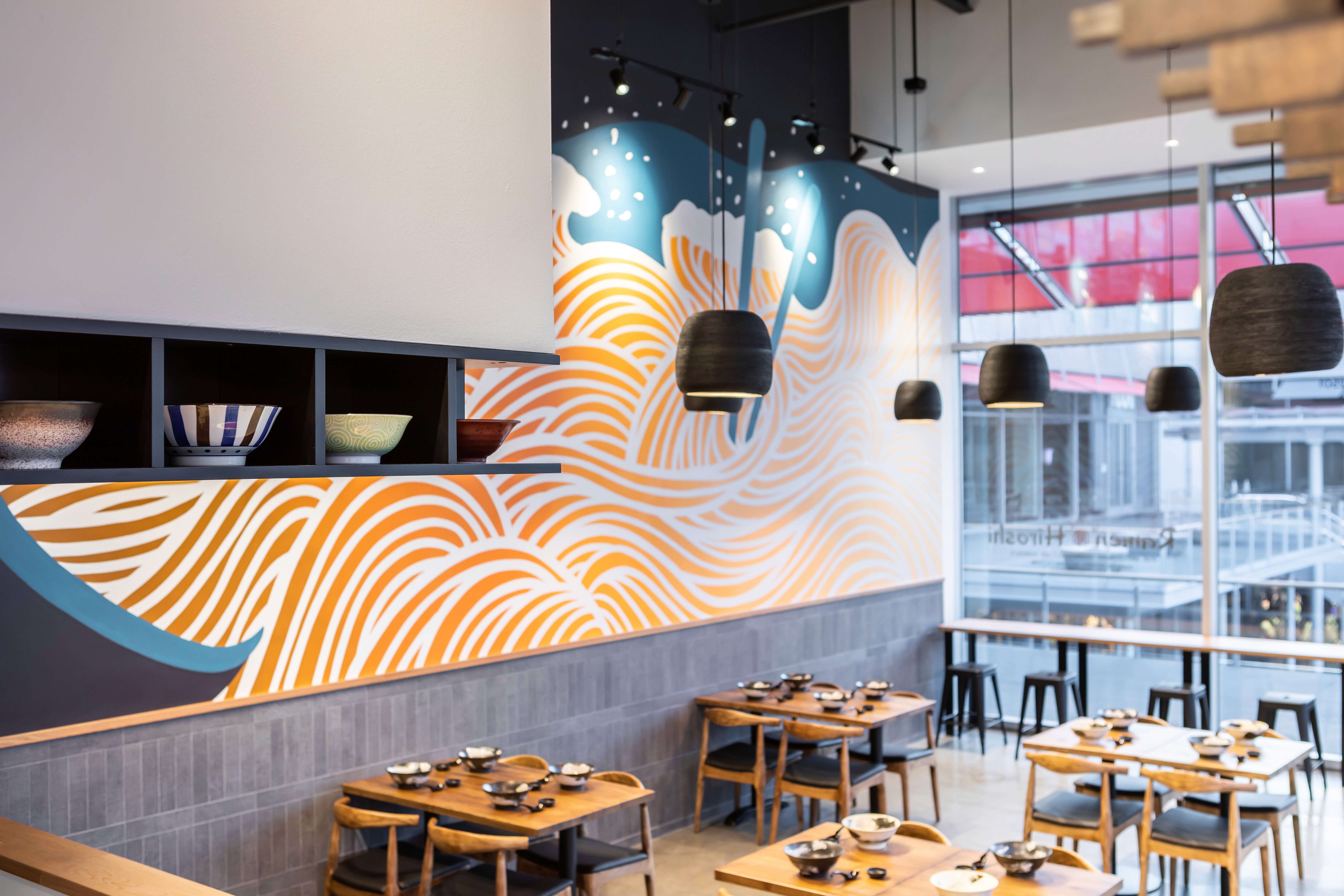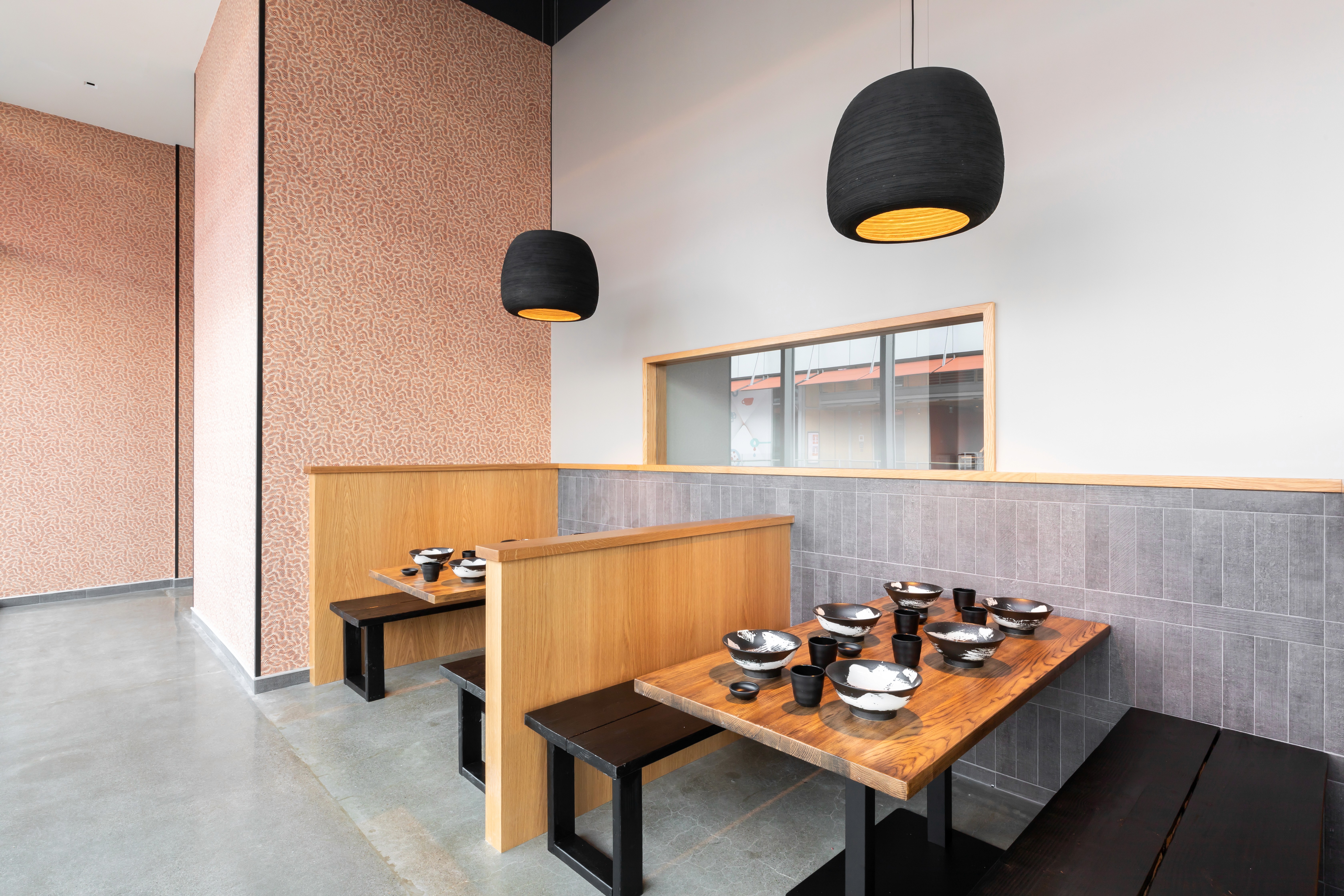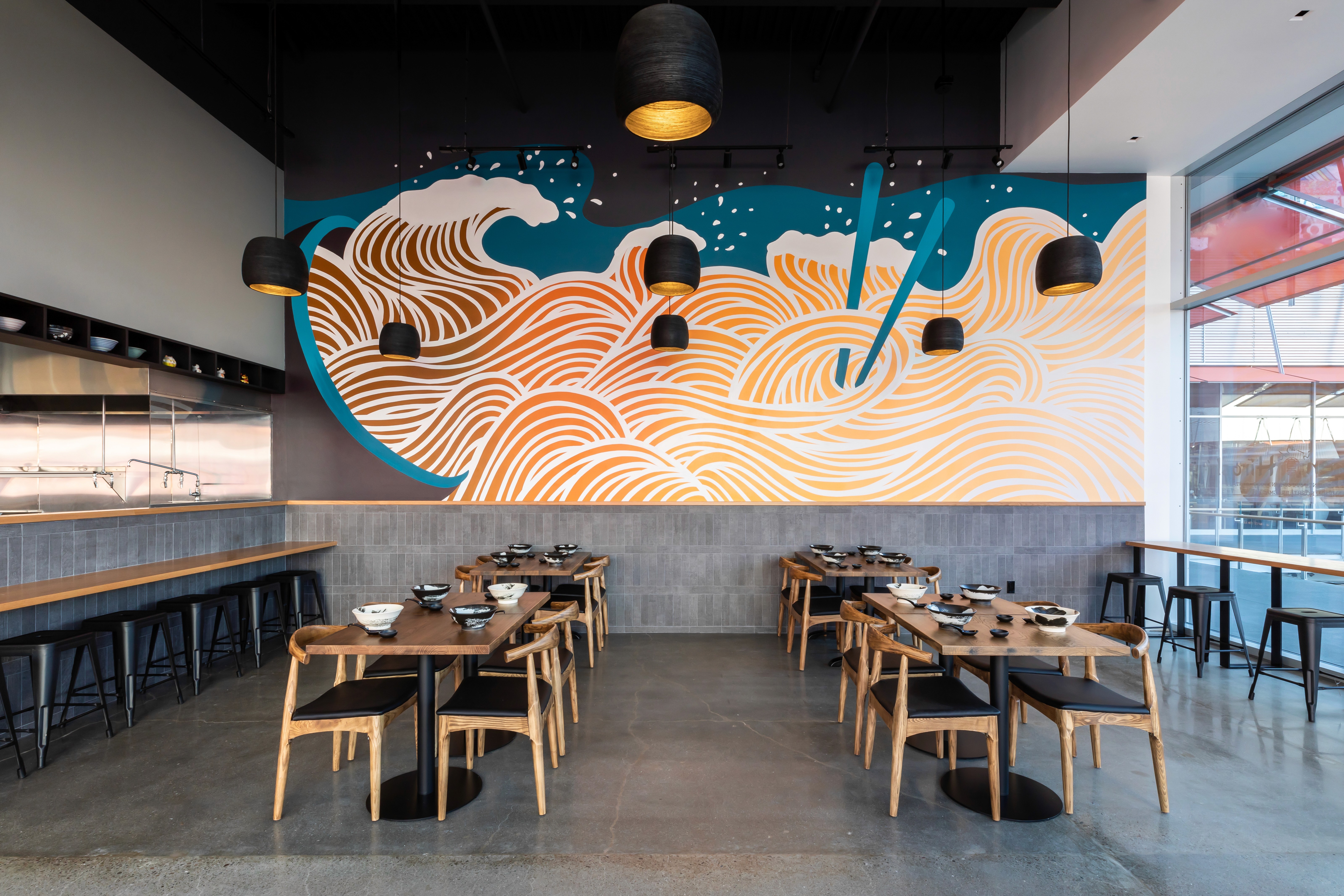 Upon entering Hiroshi, focus is drawn to the Japanese-inspired mural spanning the length of the restaurant titled “Noodle Waves at Night.” The installation—featuring an overflowing bowl of ramen noodles resembling ocean waves underneath a starry night sky—is commissioned by local art firm, Local Language. Balancing a bold, colorful mural with clean, angular forms, the dining room features simple seating, including a long walnut table with a modern touch, for large parties or communal seating, amongst black barstools. Booth seating and smaller tables fill the space which accommodates a total of 48 seated guests. Overhead, handcrafted black ceramic pendant lights illuminate the space, while floor-to-ceiling storefront windows fill the interior with natural light throughout the day.