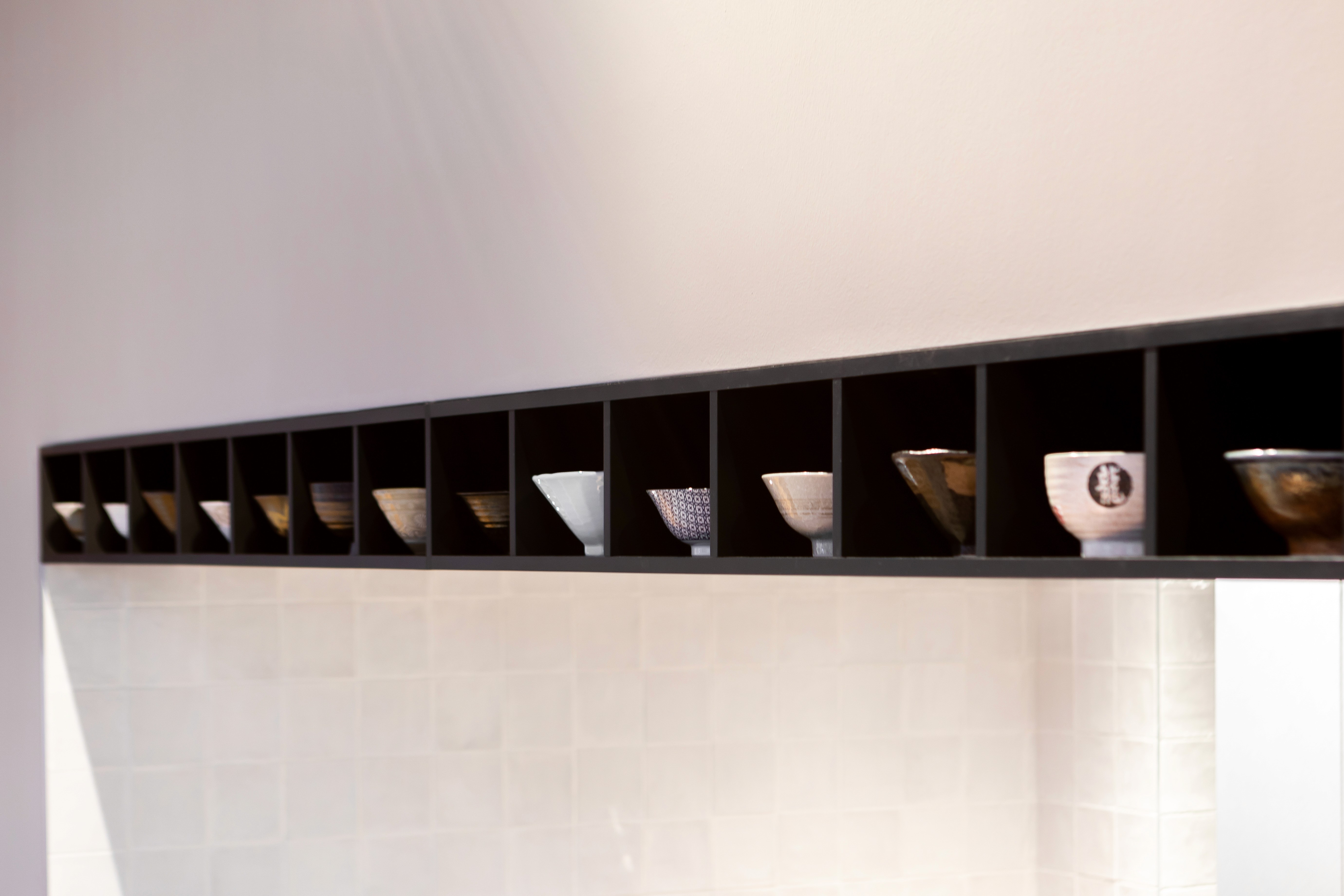 Wrapping both the interior walls and L-shaped counter is dark grey tile wainscot paneling, with a simple, yet striking, light grey accent tile behind the bar, reminiscent of shou sugi ban, an 18th century Japanese technique to weatherproof wood. To underline the warmth of Japanese architecture, a wooden trim lines the tilework. The exhibition kitchen, surrounded by decorative ramen bowls attached to the soffit, allows guests to look on as ramen is prepared—an art form that the Ramen Hiroshi team aimed to share with all visitors who enter the space, which is represented in the design and layout of the space. Four seats are situated at the east end of the kitchen where guests can dine from the bar, overlooking the kitchen.