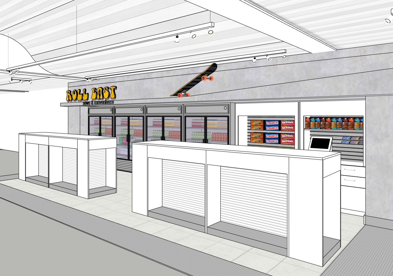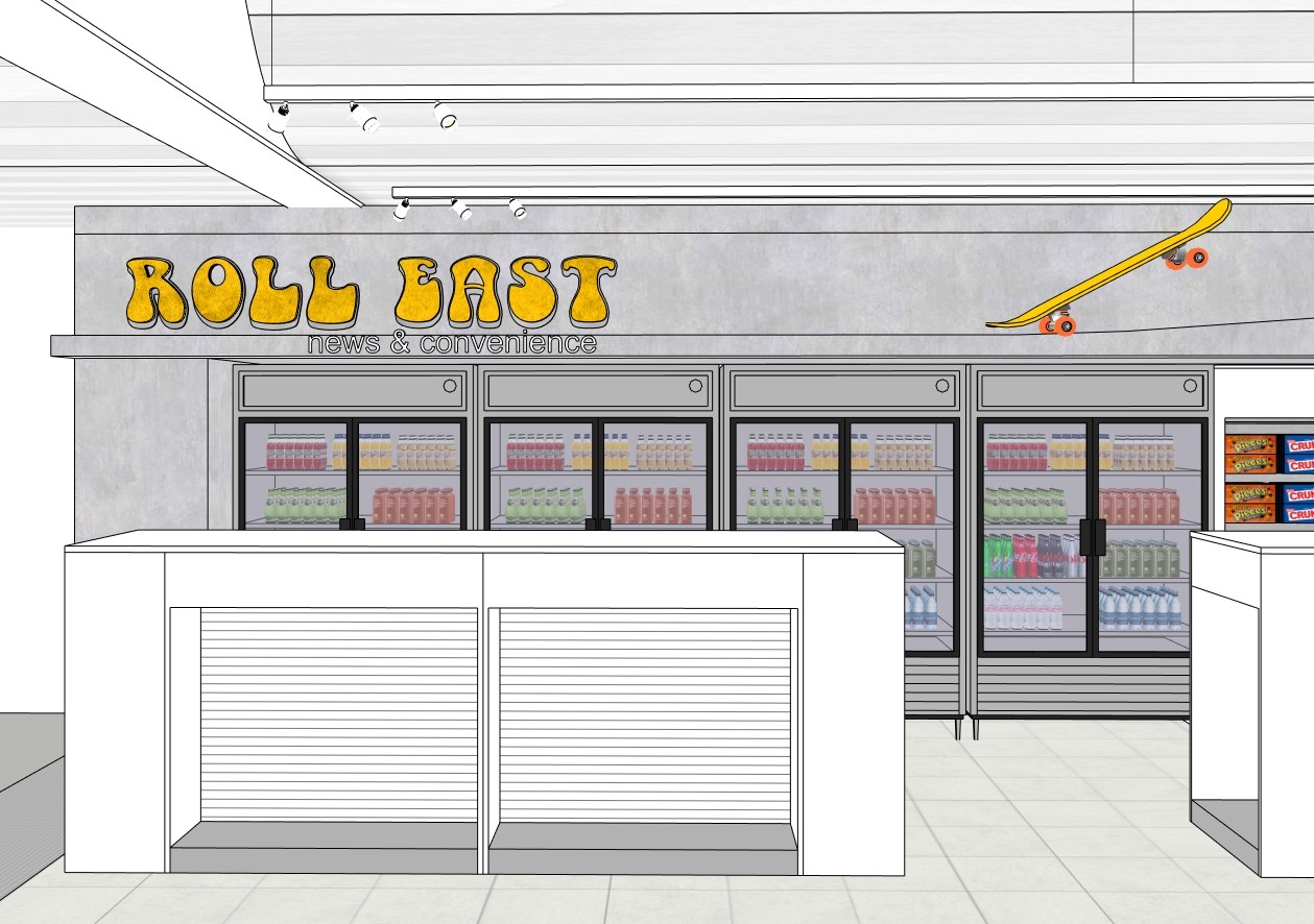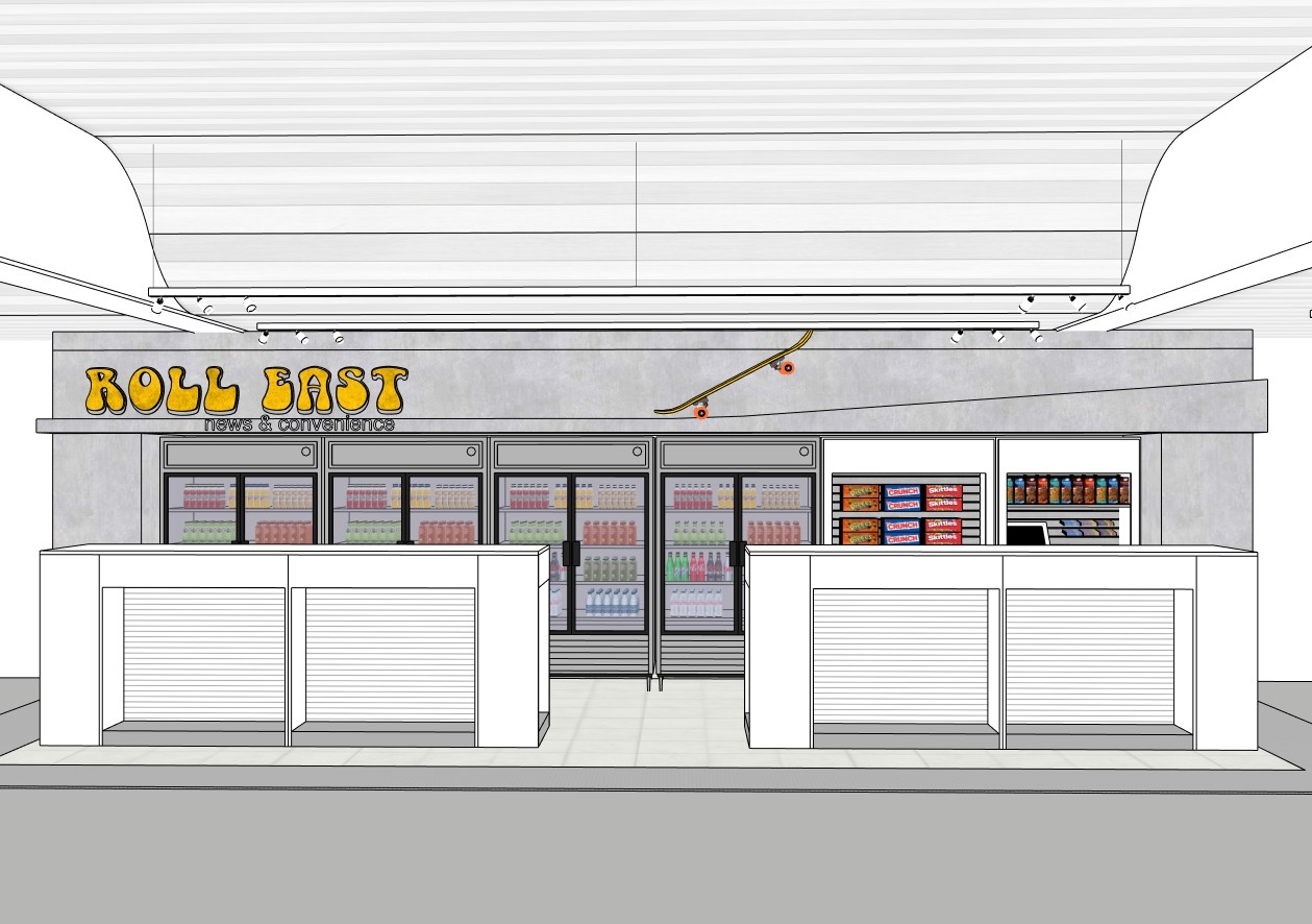 This news & convenience venue, nestled between gate-hold seating captures the Oakland mood and spirit found at local four skate parks.
