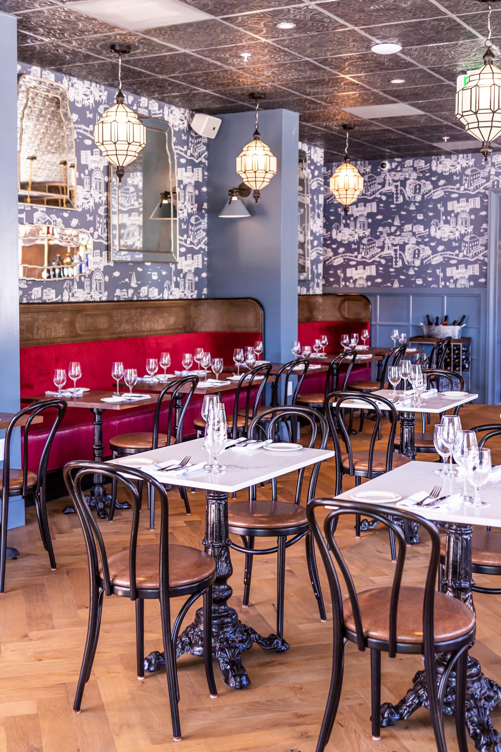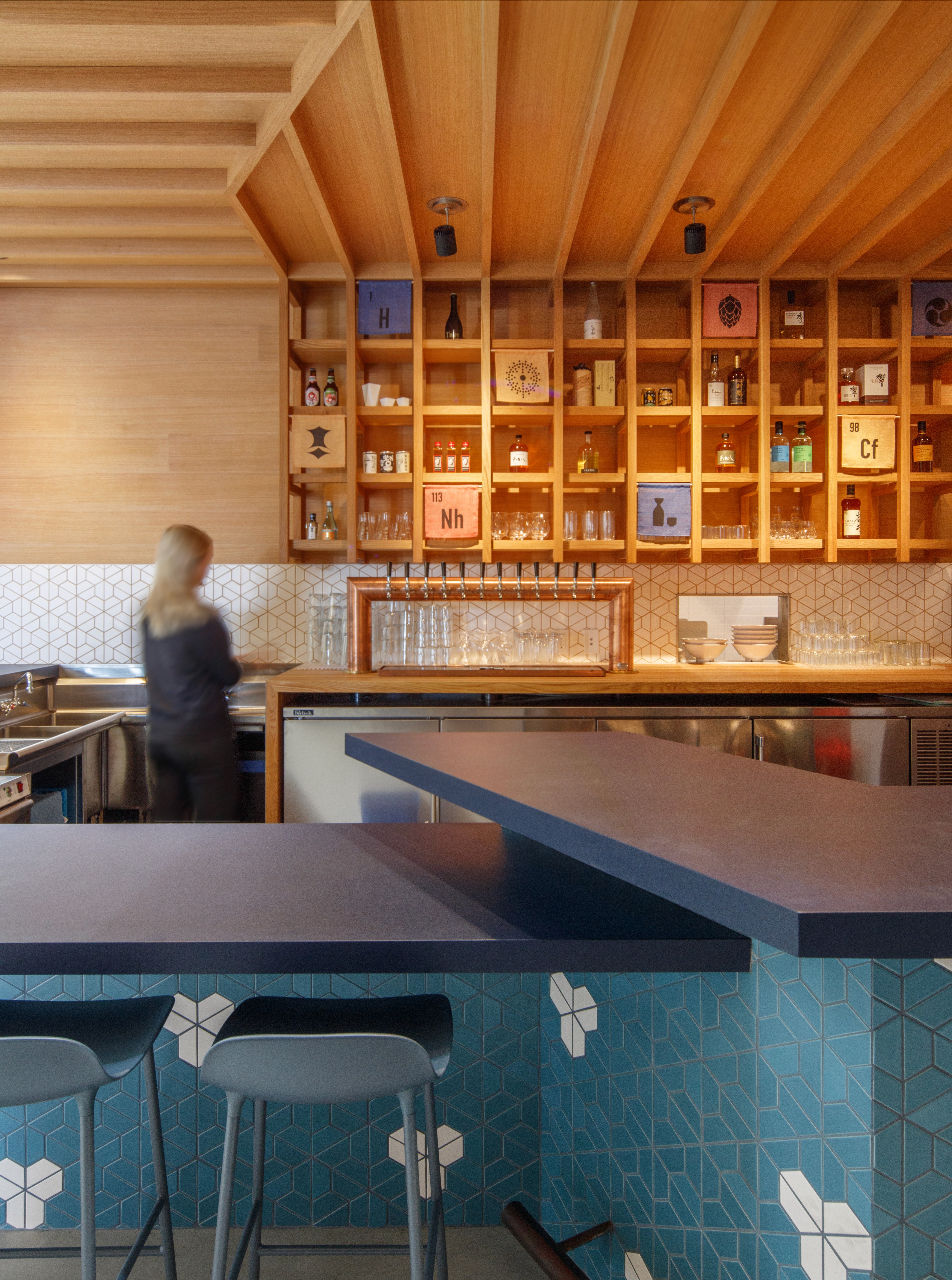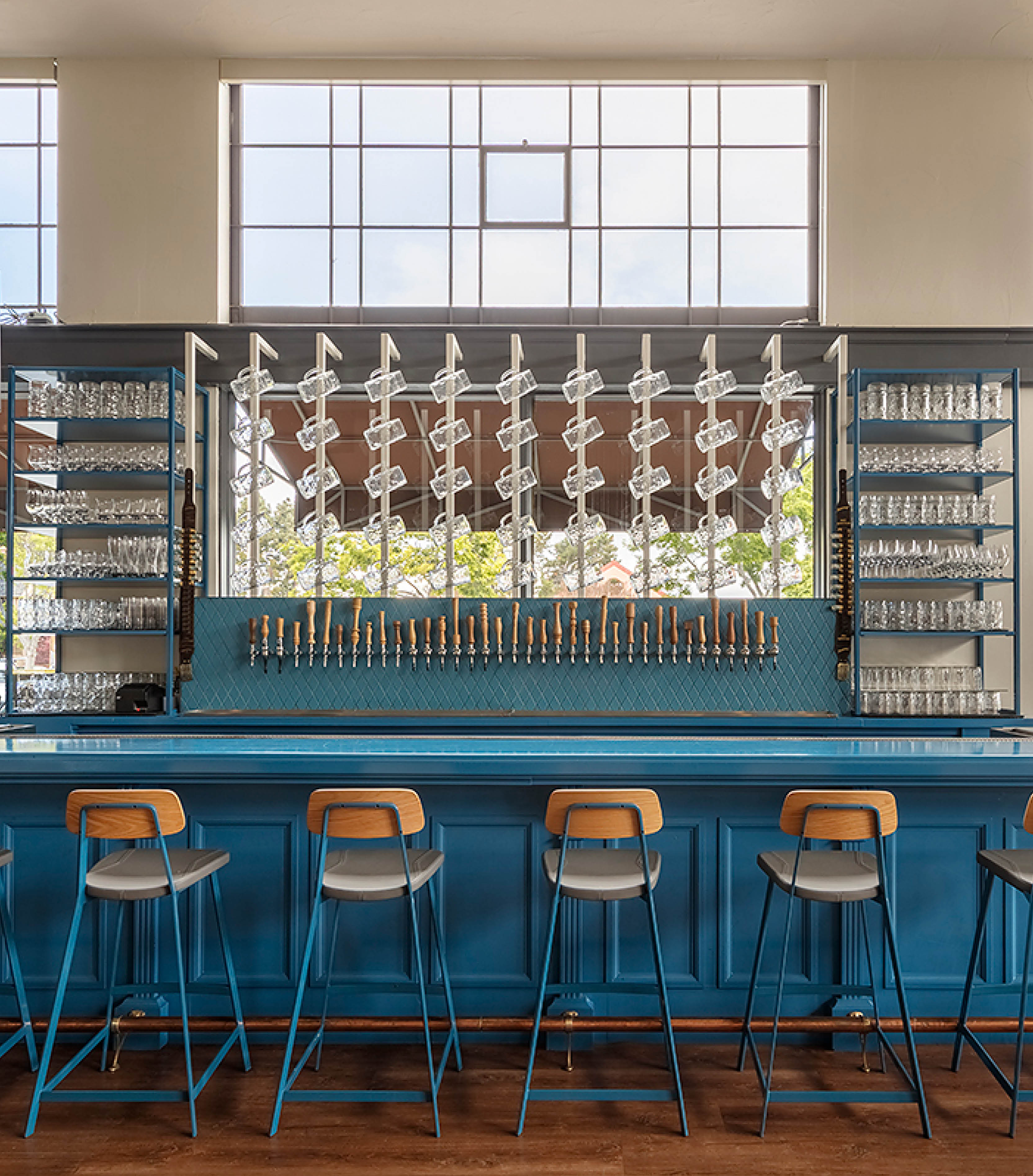 Bavaria’s quintessential blue and white harlequin pattern served as starting point for the color palette; Arcsine deepened the blue for a more modern take and added grays and creams along with warm copper and wood tones throughout. The color scheme is particularly impactful at the bar, where bold blue color blocking is the focus.