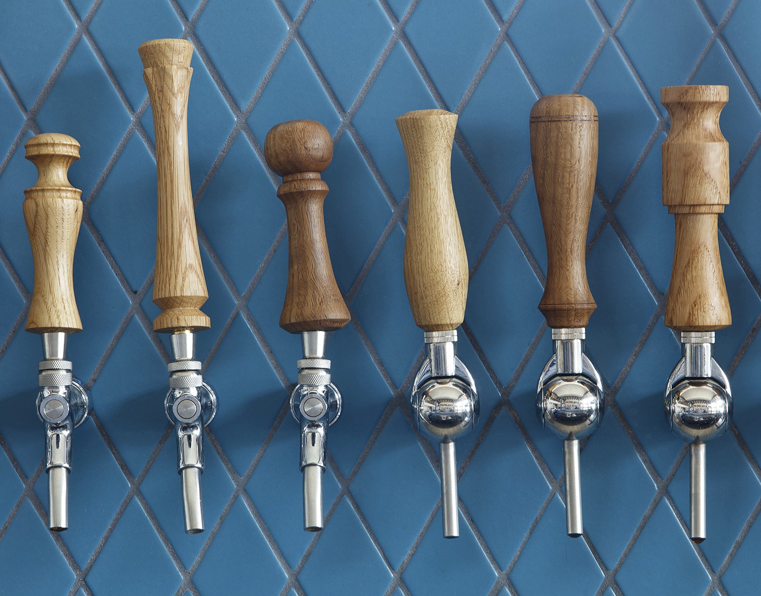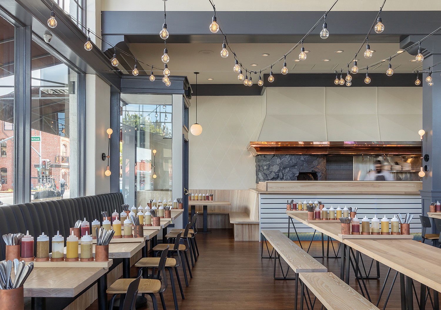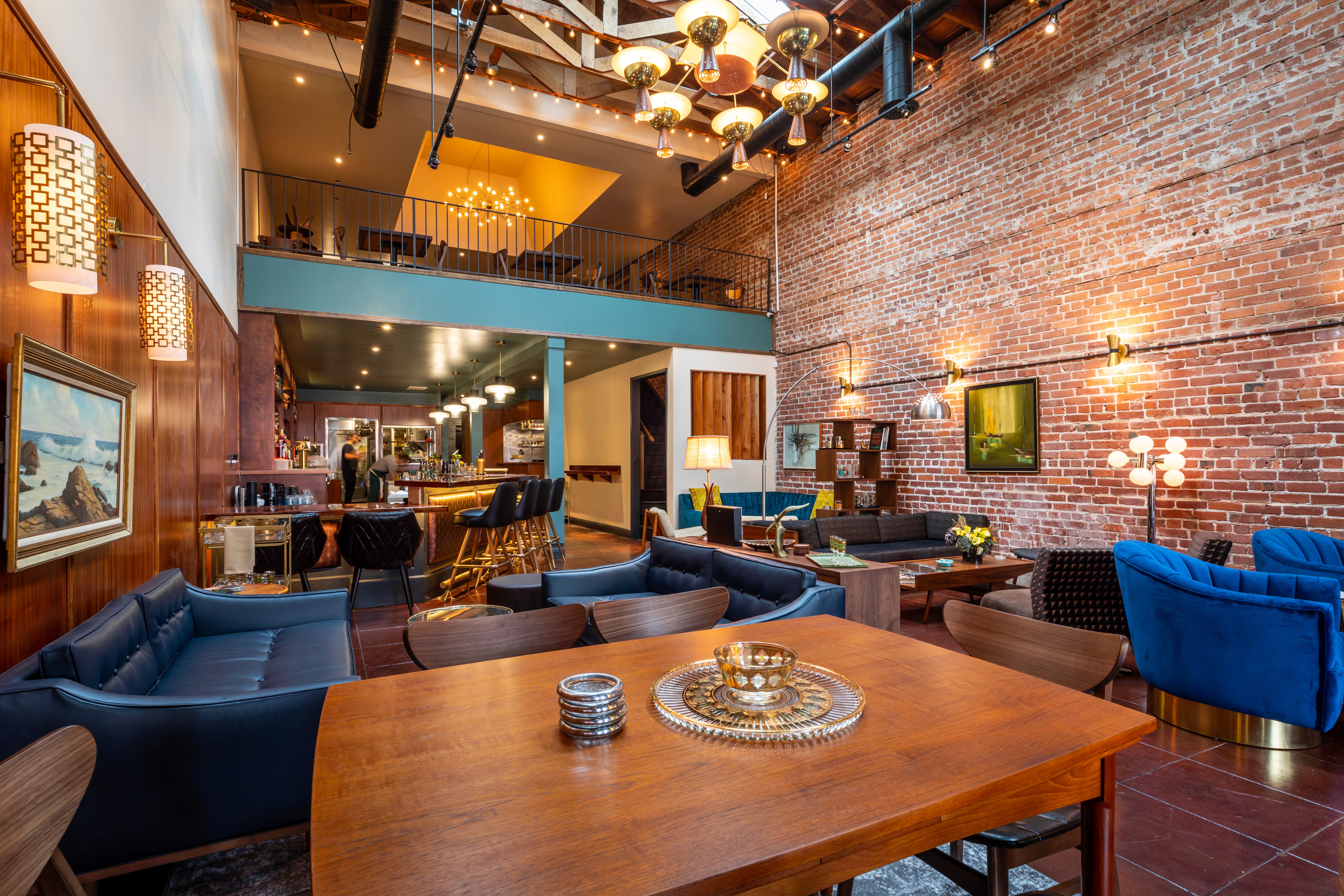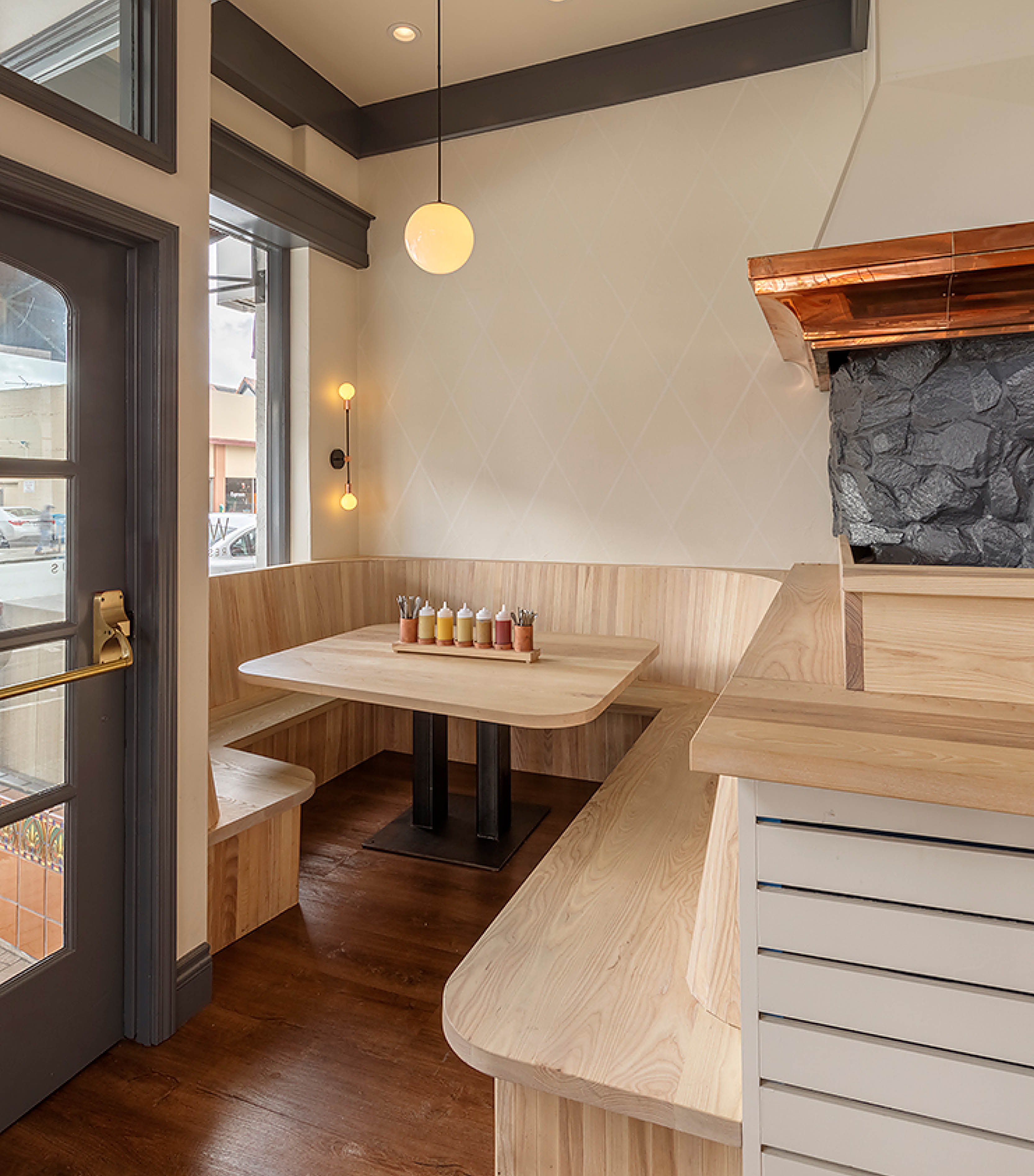 Bavaria’s quintessential blue and white harlequin pattern served as starting point for the color palette; Arcsine deepened the blue for a more modern take and added grays and creams along with warm copper and wood tones throughout. The color scheme is particularly impactful at the bar, where bold blue color blocking is the focus.