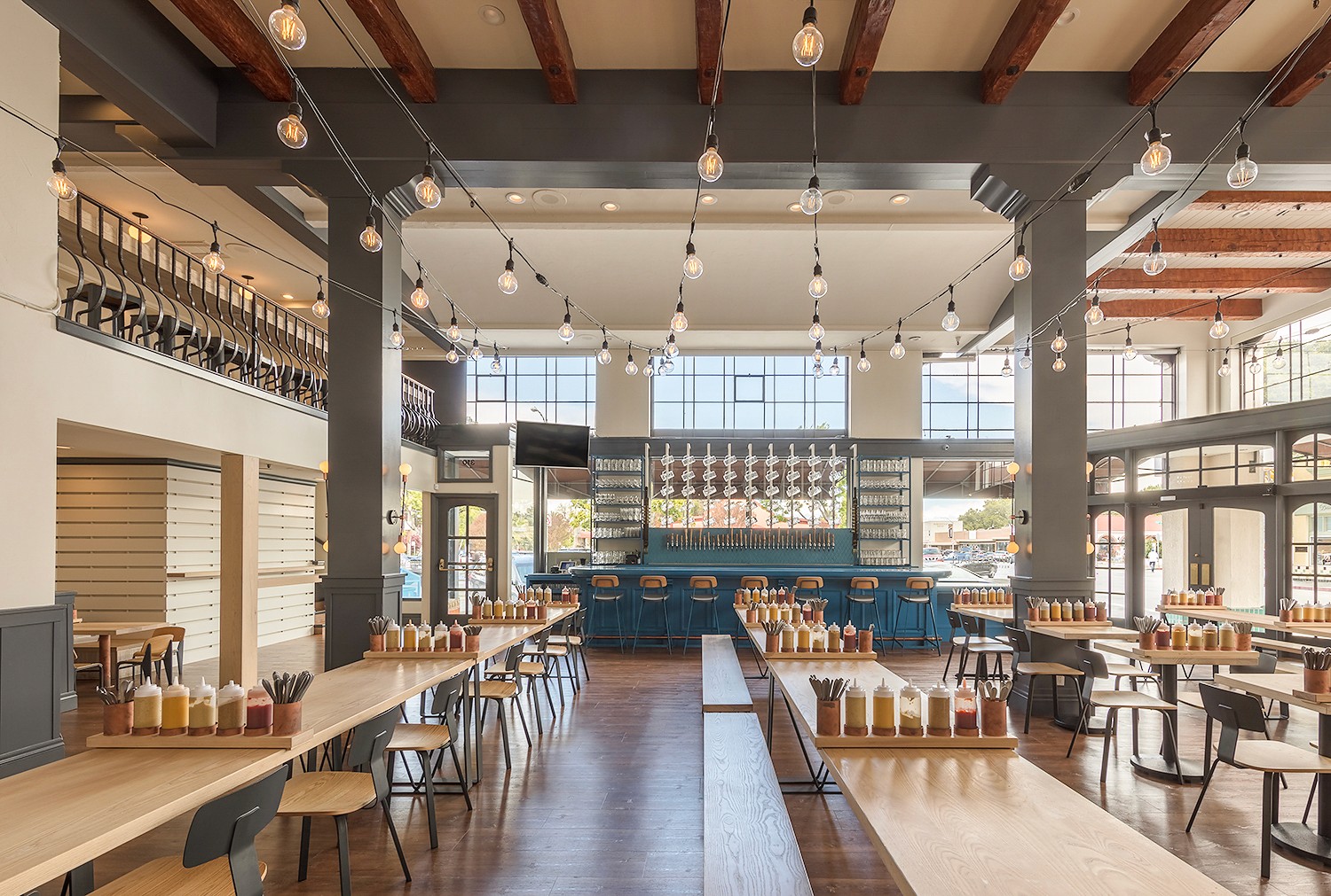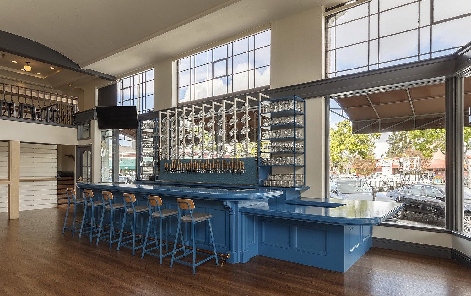 Arcsine incorporated a contemporary aesthetic to create a space that is fresh and family friendly. The bierhaus’ corner space in a historic building features lofty double height ceilings, tall columns and factory style windows that bathe the space in natural light. By simplifying the existing interior and utilizing a clean and contemporary design aesthetic, Arcsine was able to highlight the historic detailing and create a warm and inviting atmosphere for guests to linger.